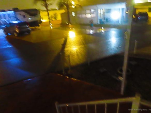 My focus over the weekend was very much on relaxation. I did a few chores, but mostly read and watched TV. I didn’t even take any pictures to include in this blog entry. When it started to rain, while writing this entry, I opened the door to take the one picture of the rain I’ve included here. The overall quality of this blog entry is low, but goes along with the relaxed nature of my weekend.