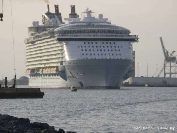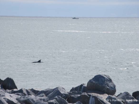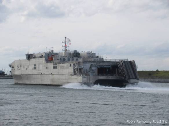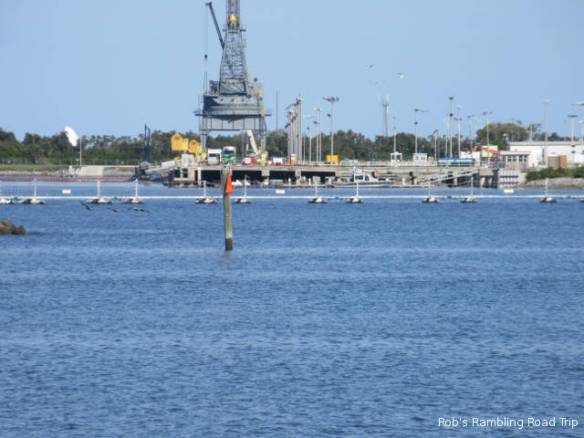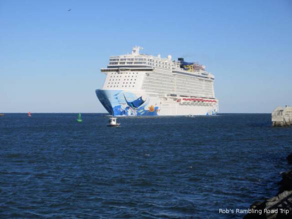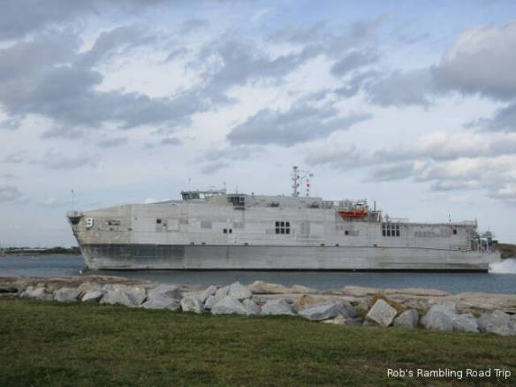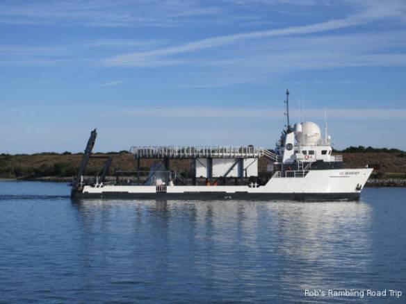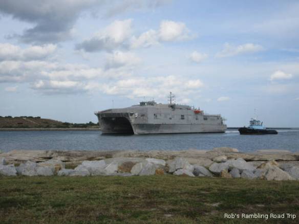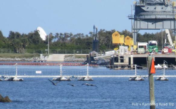 The travel part of my day went according to plan, but the start of the day was another matter. I saw a cryptic entry in the Port Canaveral Pilot schedule on the web yesterday. It read “7AM USN Arr TN SST”. My guess was a Submarine was arriving at the sub dock across the channel from the campground. I set my alarm for 6:30 so I could walk over to the channel, but for some reason it went off at 5:30. With plenty of time to roll over and go back to sleep, I slept through the arrival time. I woke up at 8am and missed the arrival of the submarine. When I did get over to the channel it didn’t look like there was anything at the dock, but the gate across the opening to the basin was closed. Looking closely it was possible to see a submarine sitting close to the water beside the dock.
