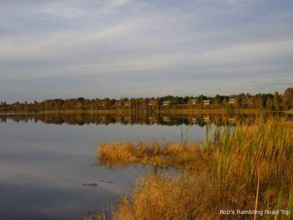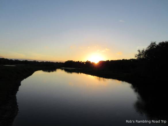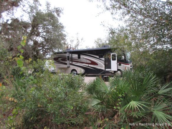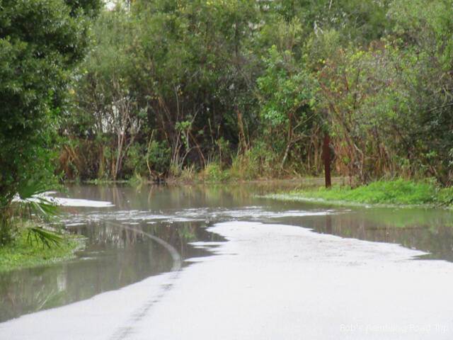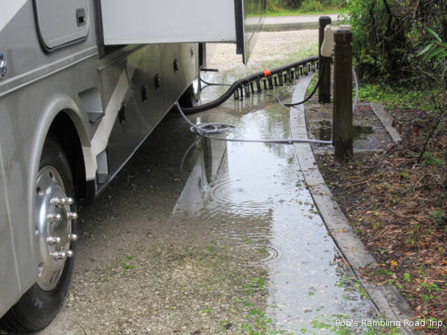 The first wave of storms was gone by nine. Three to five inches of rain were reported around the area and the main wave of storms was still moving in from the west. Walking around the outside my RV during the lull in the heavy rain, I found puddles four or five inches deep behind my RV. The campground loop road was also flooded not far up the road from my site. Before the day was out there were reports the county route from the campground back into Sarasota had flooded areas too.