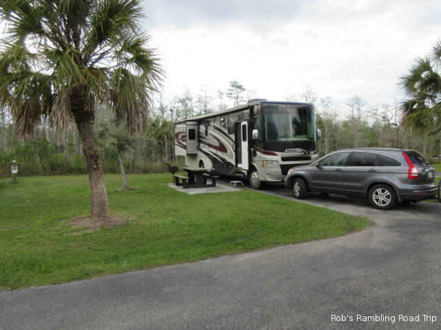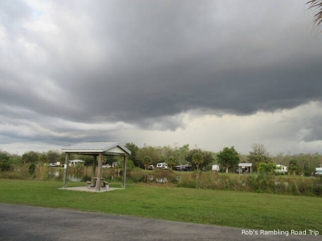 My destination was halfway across the state at the Midway Campground in the Big Cypress National Preserve. I arrived at 4:30PM and got setup before the threatening clouds to the east arrived. I saw plenty of lightening in the clouds, but they didn’t produce any rain in this area. This campground has about twenty five sites around a small pond. They warn you when you arrive and with many signs that alligators are the natives in the pond and bears in the woods. So far I’ve seen a gator on the band of the pond across from my site. If I see a bear, I hope it’s further away.