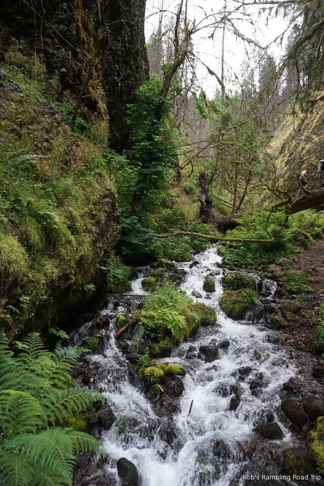 The big parking lot in the median of Interstate 84 was close to full by ten this morning and the smaller lot on the Historic Columbia River Gorge Highway was overflowing. I had plenty of company on the trails. Ultimately all of the people contributed to my turning around on the trail to the top of the falls. The mile plus long trail from the road up to the top of the falls was very congested. The eleven plus paved switchbacks that make up the trail were slippery from recently being in the clouds. Trying to navigate around the large groups of people that stop in the middle of the narrow paths with steep drop offs was a challenge. When you throw in the little kids barely old enough to walk wandering among the people and dogs on leach, it’s a disaster waiting to happen.