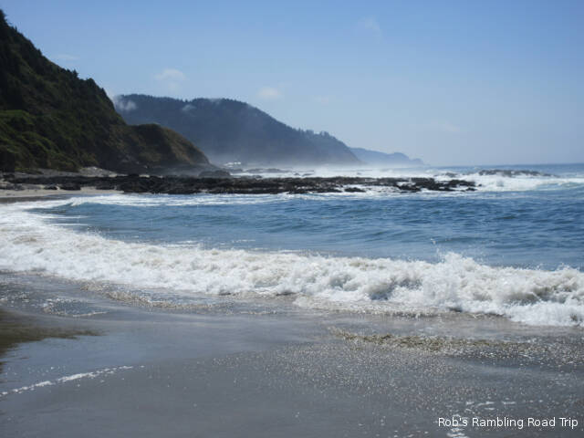 North of Florence Oregon the dunes are pretty much done. The road starts to climb onto high cliffs along the ocean. US 101 gets pretty twisty as it hugs the coast in some areas. I followed the road north twenty miles or so beyond Florence before I turned around. On the trip back I stopped at many of the turnouts and waysides to view the Pacific, take a few pictures and walk on the beach. This area has a different form of beauty than the area south of Coos Bay. There aren’t as many big rock formations. Sandy beaches in front of high cliffs are more common. In the water there are low rock formations parallel to the coast that tend to make the surf break early.