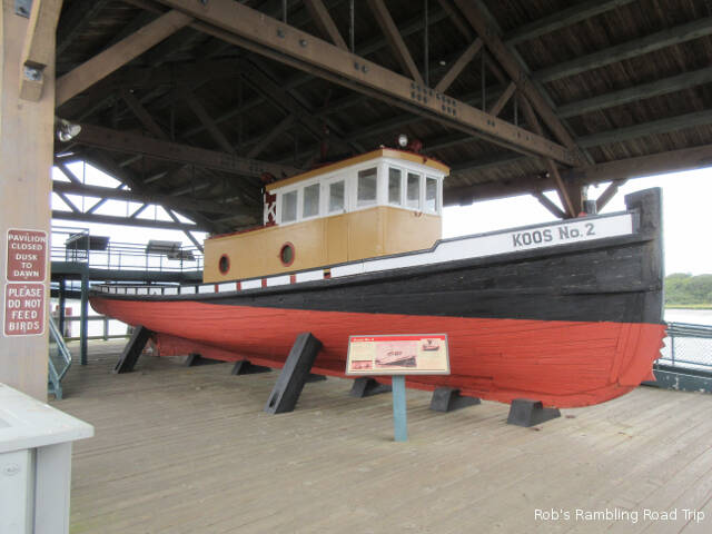 The boardwalk has exhibits and historical placards along its length. In the water beside the boardwalk is a marina area. Most of the boats tied up are sailboats that look like they have been there for a while. The boats are all buttoned up for protection from the elements. There are also a couple of odd boats tied up at the outside bulkhead. The one that stands out the most was a large ocean going tug with a New York registry. It seems to be a long way from home and is currently being painted.