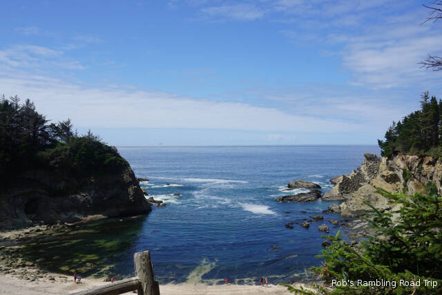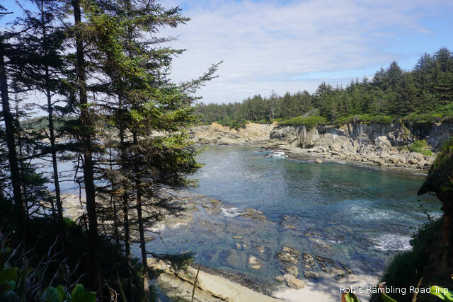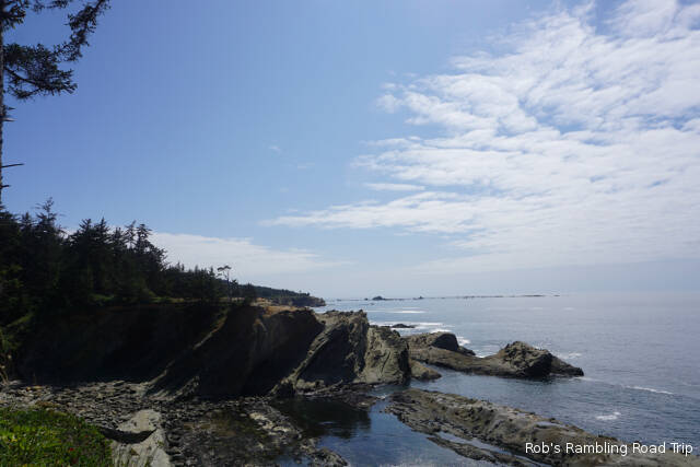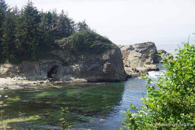 Shortly after noon I headed for the coast. It was time to verify that the Pacific Ocean was still there. My first stop was at the beach in Sunset Bay State Park. The view out into the ocean was restricted by cliffs along both sides of Sunset Bay. The tide was away from the shore but rising making it dangerous to explore along the cliffs. Getting trapped by rising water would be a good way to start my visit to the coast.