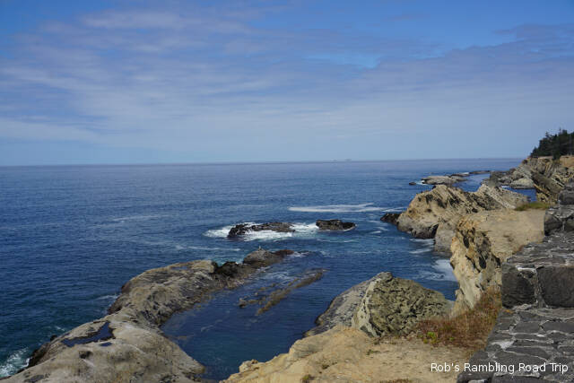 Next up on Hike along the cliffs overlooking the rocky shore. The views of rock formations and breaking surf were majestic. I even got to see some sea lions and seals on the rocks. I only walked one section of the trail. I wasn’t prepared for a long hike. The sun along the shore was heavily filtered by the clouds making most of my pictures look washed out and as usual my binoculars were back at my RV home. I’ll return another day with my binoculars and some water for the hike. Hopefully, the sun will be shining next time.