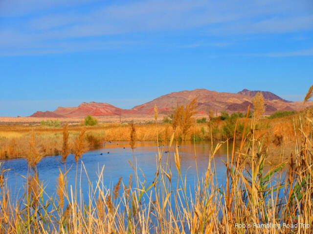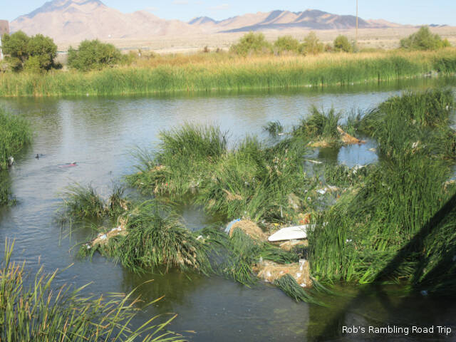 On my way back to my RV home I stopped at the Clark County Wetlands Park again for my daily exercise. The park is still showing signs of the rain storms earlier in the week. The gravel paths were a little muddy, so I stayed on the concrete paths. More junk has flowed down the Las Vegas wash to get caught in the brush and tall grass at and below the dam. It seems to be even higher above the normal water level than it was before the last rain. The task of cleaning it up is getting bigger.