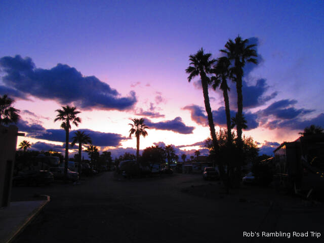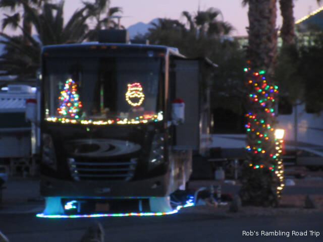 Back at the RV park this evening, I walked around looking for new Christmas decorations. The park office has turned on the Christmas lights at the Club house. They have lots of white lights on the building. It looks festive, but I would prefer more colored lights. In the park one of the residents has put a big inflatable Snoopy on the roof of their box trailer. The same people decorated this way two years ago. They had to replace the inflatable twice that season because of the wind. Hopefully, this time year they will have better results. I’ll continue watching for more decorations on the nights to come. I may put my lights up tomorrow.