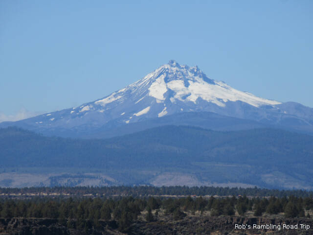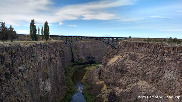 1909 railroad bridge across the Crooked river. Two snow capped mountains in the Cascades range peek over the bridge deck.