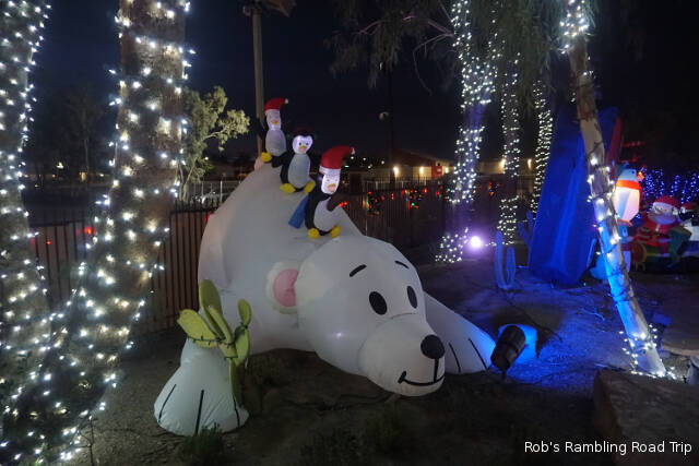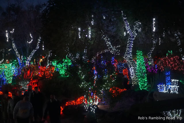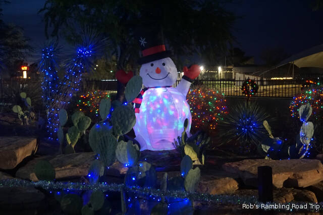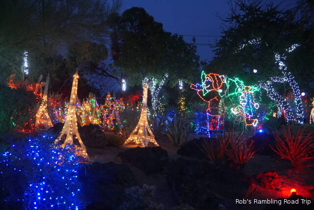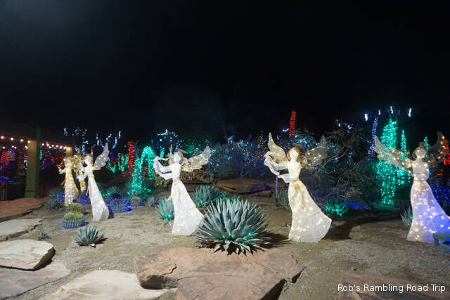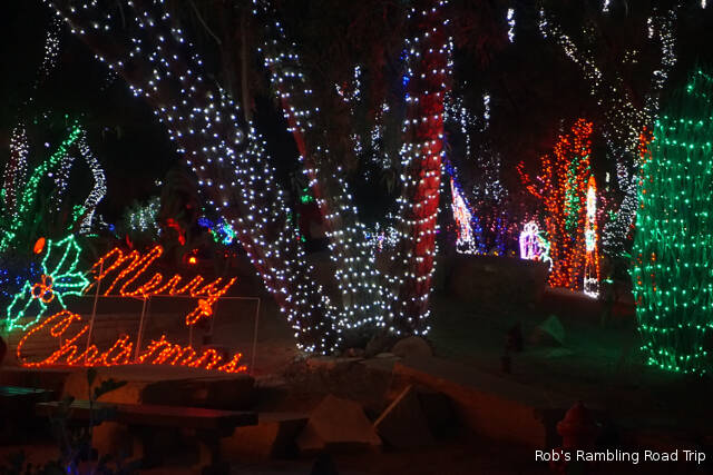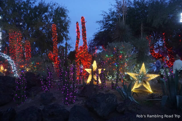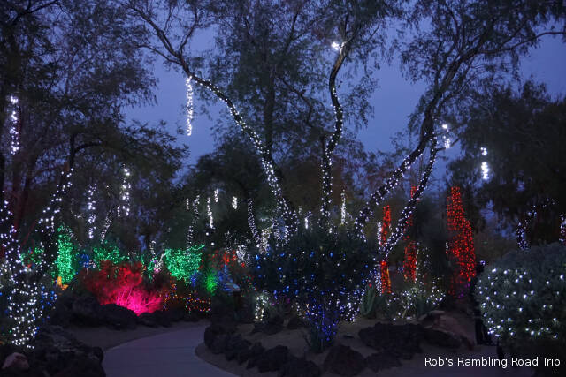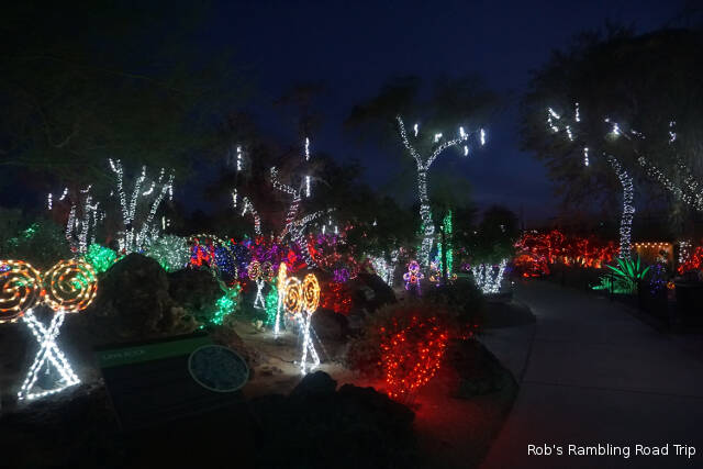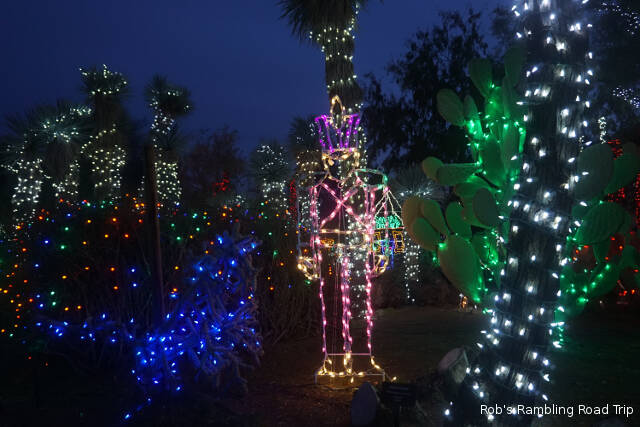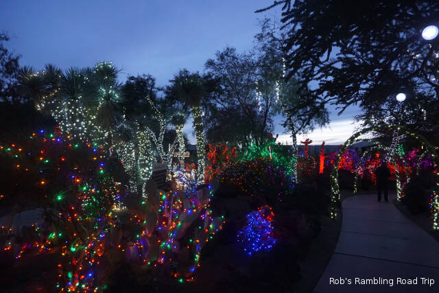 I watched football on TV most of the daylight hours today. Toward evening I drove out to the Ethel-M Chocolates Cactus Garden to see the decorations on the all of the cactus. The celebration has been going on since November 5th, but I held off until now to visit. December 1st is at least in the middle of the Holiday season. I arrived just before dark, but many other people had already arrived. At least three of the factory parking lots were full when I was leaving. I’m sharing some of the many pictures I took in hope that it will convey the magnitude of the immersive experience.