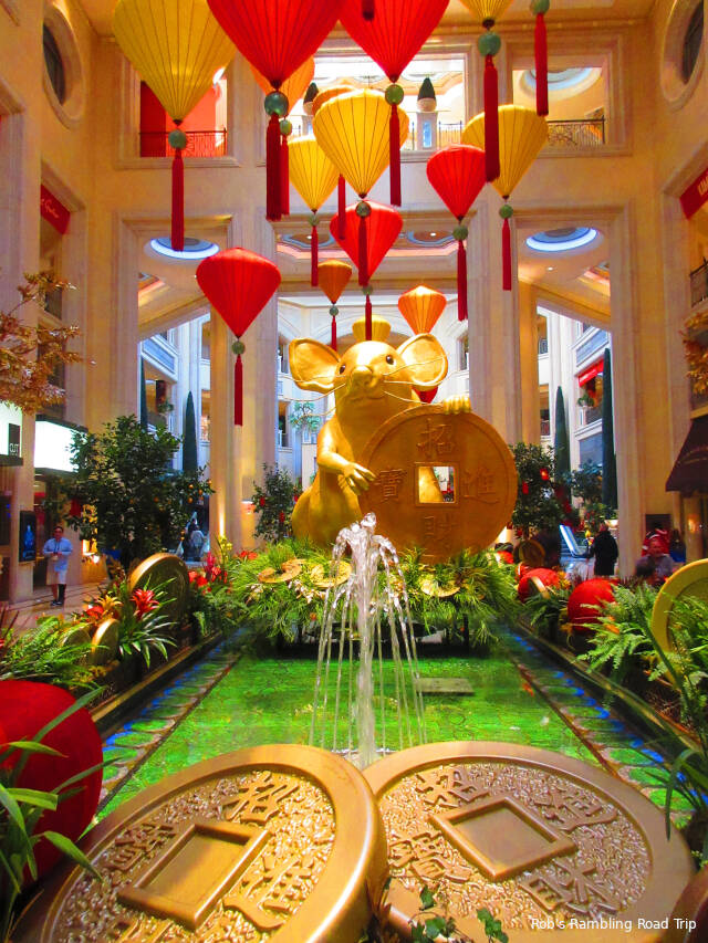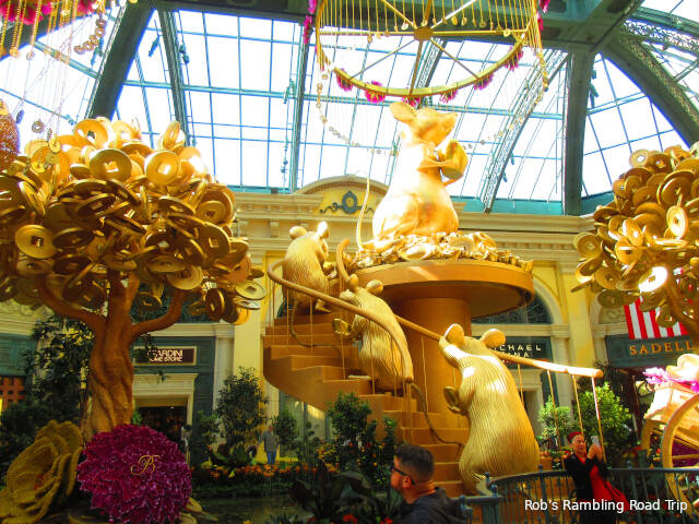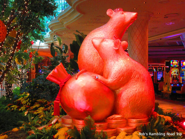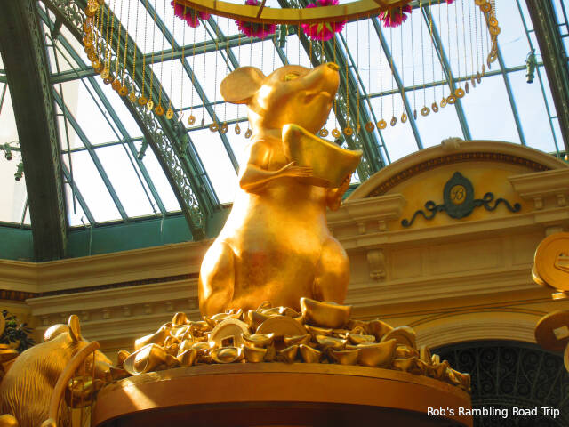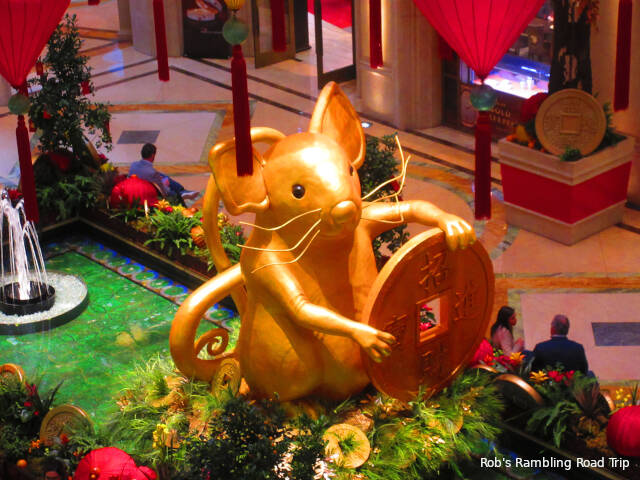 I went back up to the Las Vegas Strip today. The Christmas decorations have been replaced by Chinese New Year Decorations. This is the Year of the Rat. Stylish gold and jewel adorned Rats are featured in the decorations. As usual the Bellagio is over the top, but some of the others were good too.