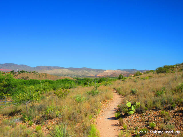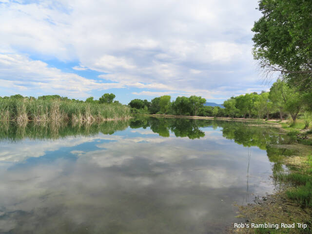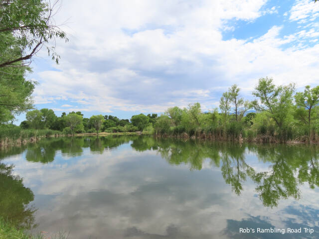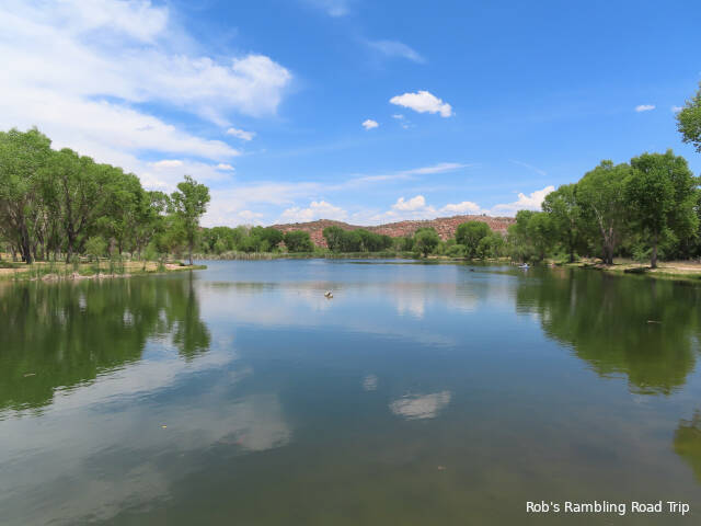 For today’s exercise I drove down to the ponds in the day use section of the park. I would walk, but the trails to that area are open to the beating sun. There were a few families enjoying picnics in the park along with a little fishing in the ponds. The three ponds are surrounded by nice green shade trees. It’s possible to walk around in relative solitude out of the direct rays of the sun. Even the ducks were taking advantage of the shade at the waters edge. This area along the Verde River is so different from the desert area on the surrounding hills where my campsite is located.