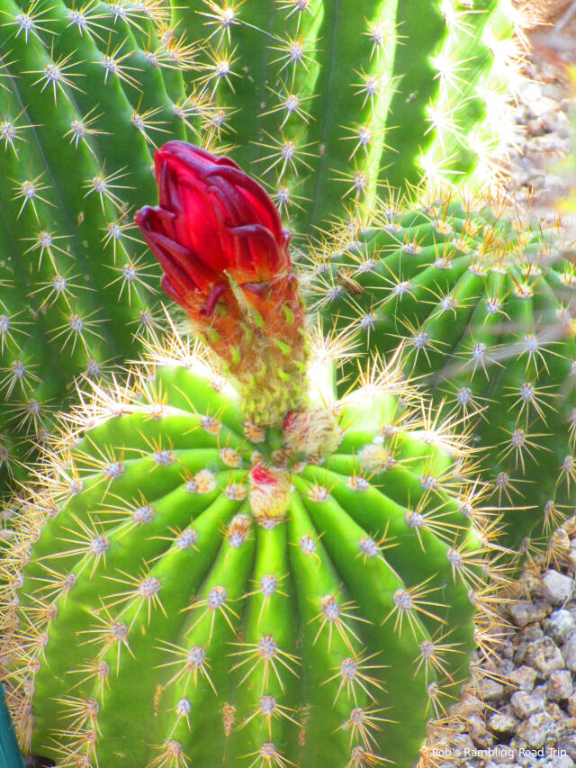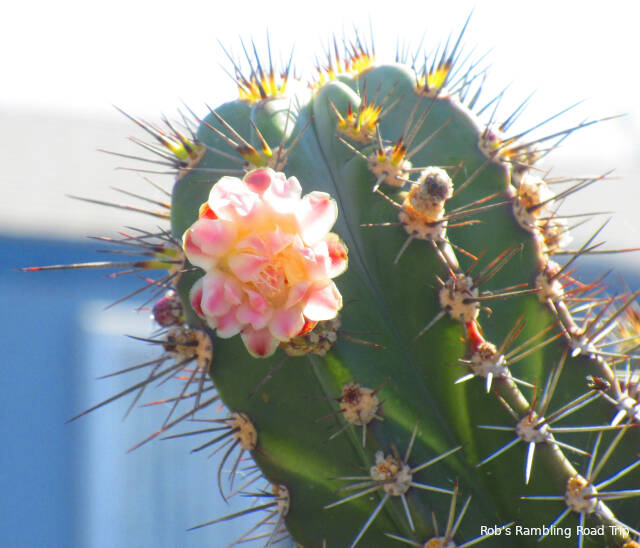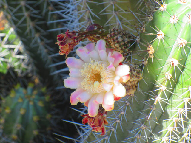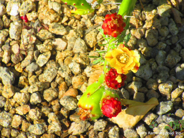 I was up early enough to get in my morning walk around the RV park before the temperature started to climb. The cactus blossoms weren’t cooperating today. None of the blossoms were fully open. I don’t understand what conditions cause the blossoms to open or how many days they open before they’ve achieved their purpose. It looks like there should be more blossoms opening in the next few days, but that’s a guess.