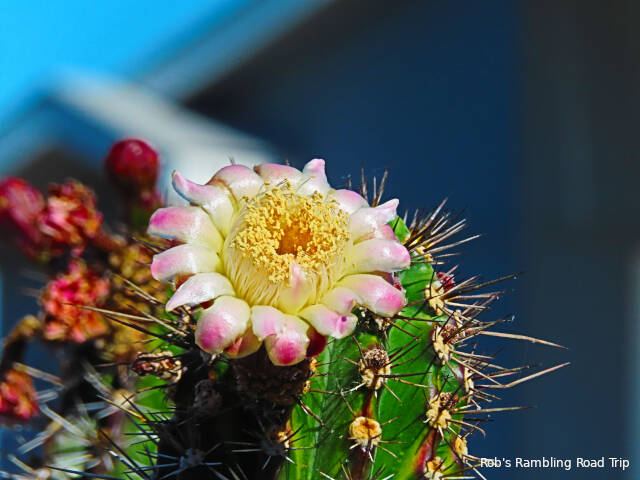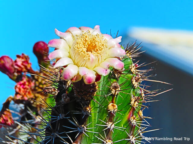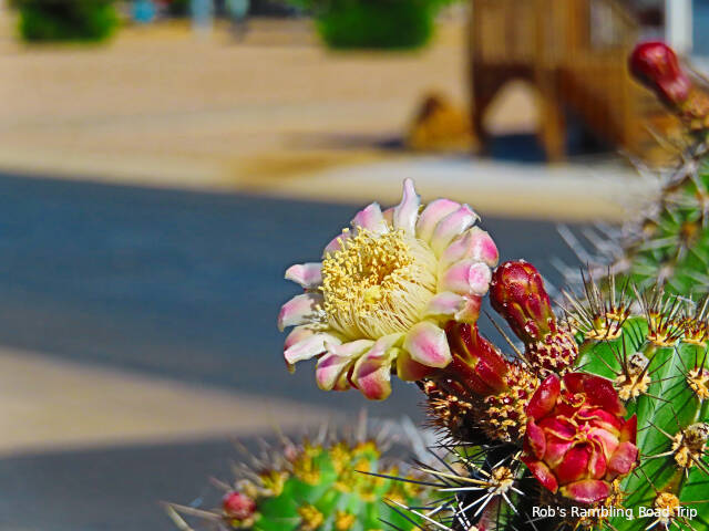 I was up early for my morning walk. My goal was to get more pictures of the cactus in bloom. The bright morning sun was successful in bringing the blossoms out of their tight closures. It was a welcome outcome after yesterday’s cloudy morning which didn’t produce any picture worthy blooms.