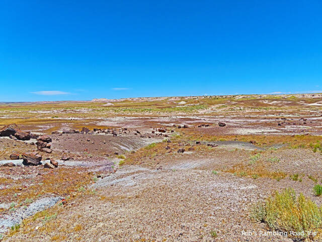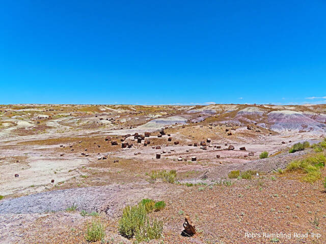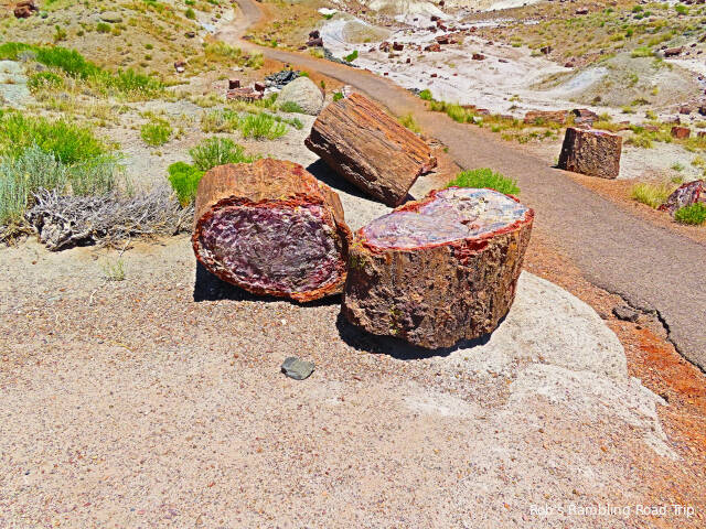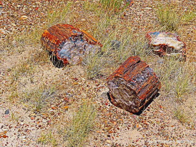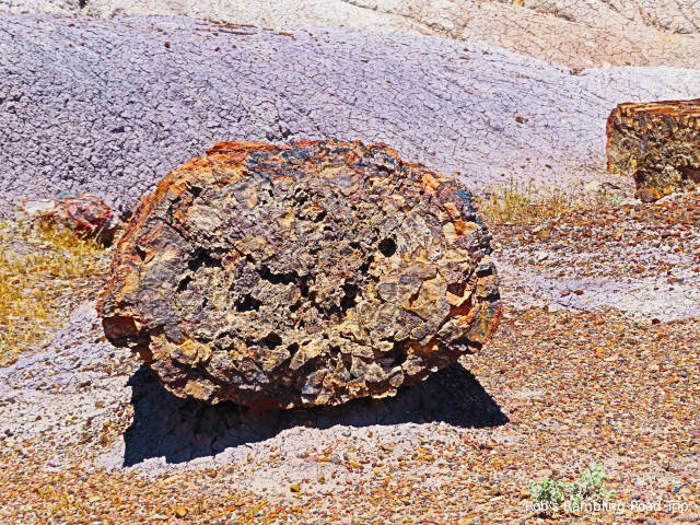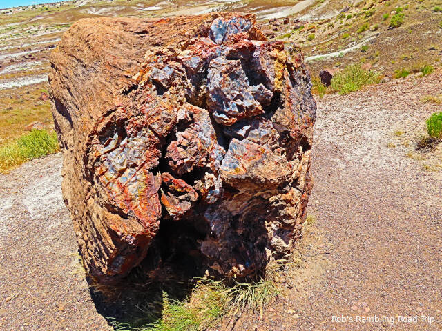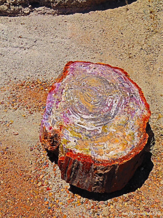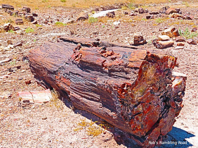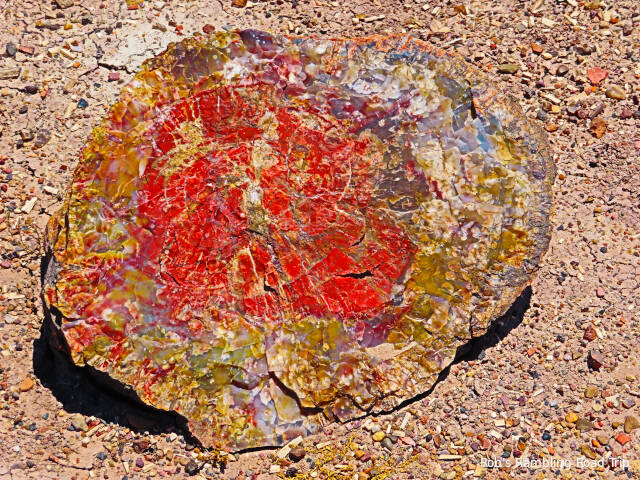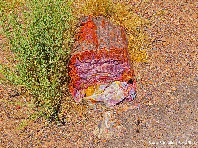 Most of my time in the park was spent hiking the Crystal Forest loop trail. The area is covered with pieces of petrified wood from a rain forest 225 million years ago. This area of land was near the equator before continental drift brought it to this latitude. There are some impressive specimens to see. Some are still in long logs and other pieces have cracked off into prefect slices. The color of the quartz in the petrified wood is dramatic. Here are a few of the many pictures I took today.