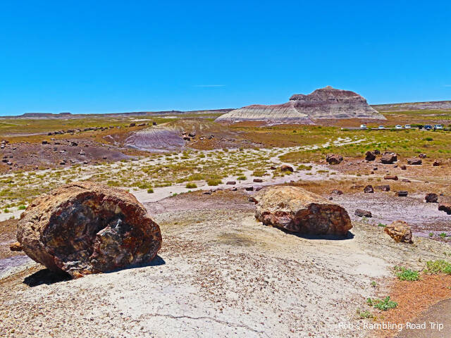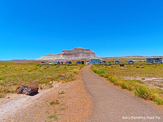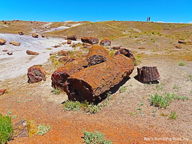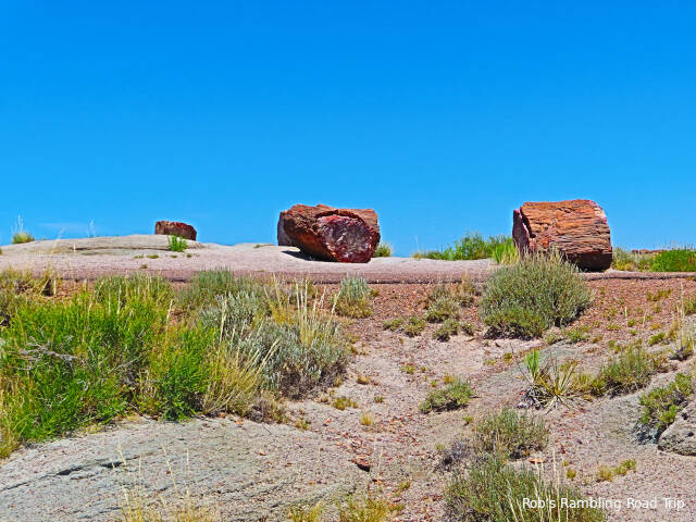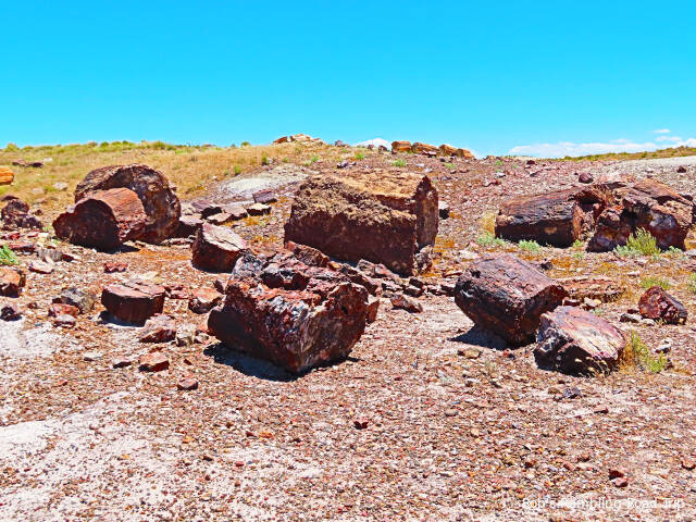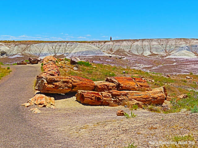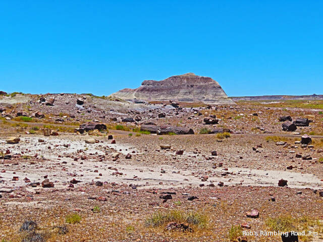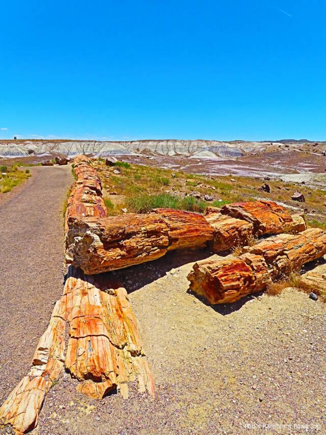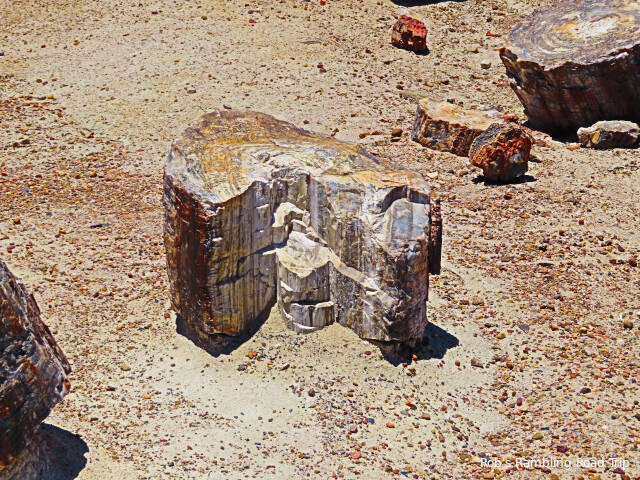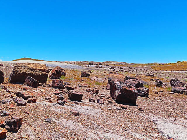 Most of my time in the park was spent hiking the Crystal Forest loop trail. The area is covered with pieces of petrified wood from a rain forest 225 million years ago. This area of land was near the equator before continental drift brought it to this latitude. There are some impressive specimens to see. Some are still in long logs and other pieces have cracked off into prefect slices. The color of the quartz in the petrified wood is dramatic. Here are a few of the many pictures I took today.