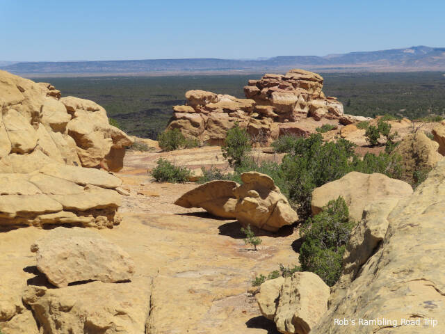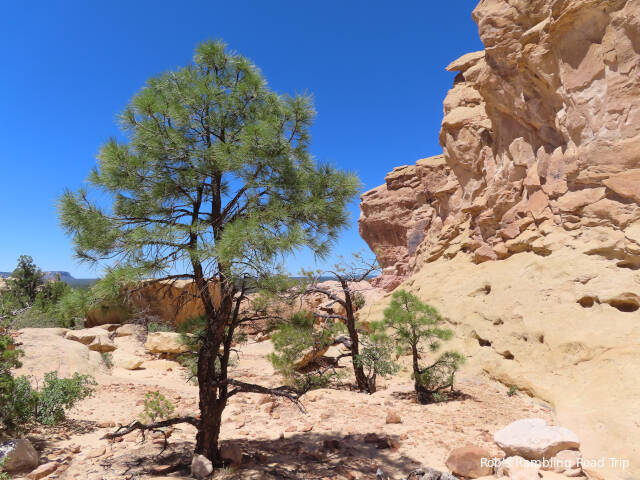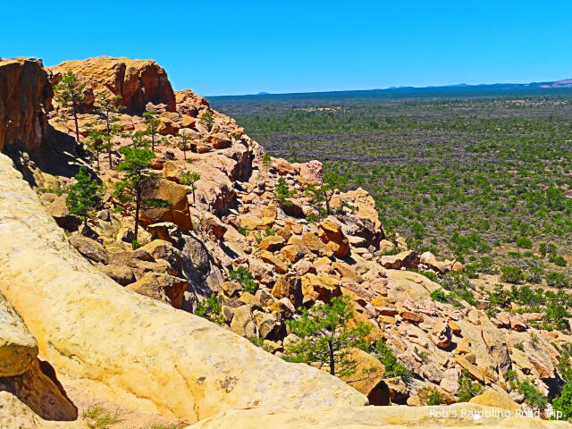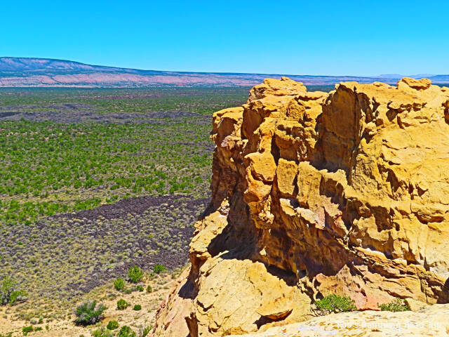 I hiked around the Sandstone Bluffs area of the El Malpais National Monument today. To reach the bluff it was necessary to drive a mile and half up hill on a very washboard gravel road. It was an uncomfortable ride. The sandstone rocks are interesting and really standout against the dark lava rock on land below the bluff.