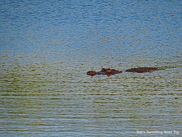 My second walk to the Backwater river was just before sunset. The area was empty and the water was relatively calm. I could here the shark music from Jaws in my head as I watched a log like object moving toward me across the water. It was a good size alligator. The amphibian moved slowly watching the shoreline. When there was activity like a car driving by or a loud human noise it stopped and got lower in the water. Only its head was visible until everything calmed down again. Eventually it reached an area just beside the boat ramp. I think it was waiting for a safe time to climb the boat ramp and cross the parking lot to a marsh area. It probably had to wait until after darkness arrived. My patience was exhausted long before the gator moved. I took several pictures of the gator. I’ve included a few here to provide a little context.