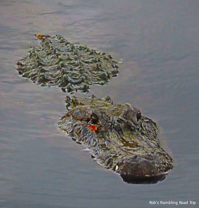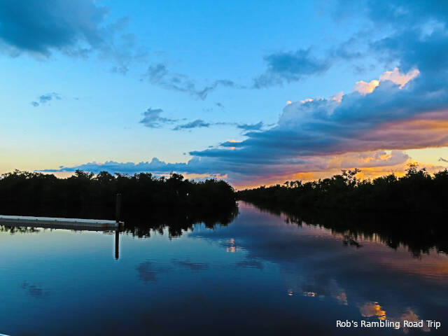 Back at the state park this afternoon and evening I had more luck catching sight of animals. The big gator that hangs out around the kayak launch on the Backwater river decided to check me out on the dock while I was waiting for sunset. It came straight across the water toward me. Once it got close enough to realize I was more of a threat than food it veered off the bee line course. I got a couple of good pictures of its size.