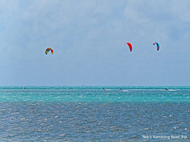 Today was the closest thing to a beach day that I’ve experienced in many years. I took a chair over to the little beach along the Atlantic Ocean and sat under a tree for almost two hours. It isn’t a swimming kind of beach, but I even got my feet wet in the warm water. Watching the Kite Boarders helped pass the time. A disruption in the beautiful weather sent me back to my RV home, but the passing cloud that dropped a little rain had moved on before I even made the few hundred feet walk home.