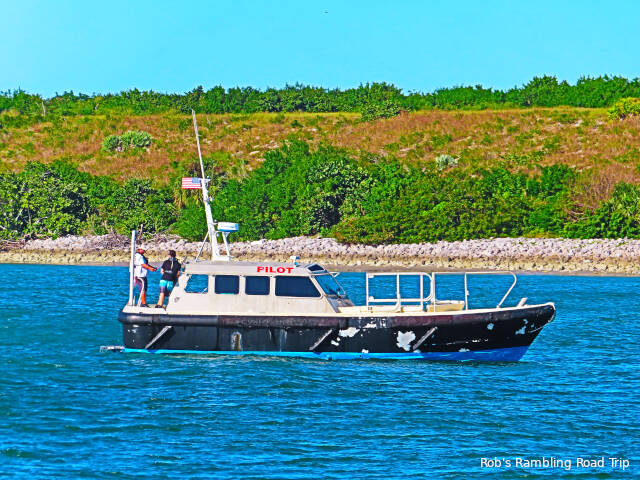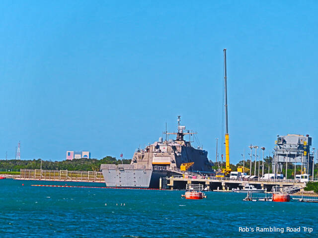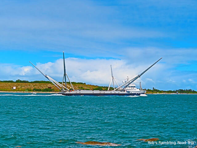 During the rainy portions of the day I worked on configuring my new phone and learning about its quirks and features. It’s always fun to do a little tech geeking out. Between showers I was along the shore of the inlet to the port or at the boardwalk along the beach. There isn’t a lot of activity in the port, but the occasional transit in the inlet can be interesting. Just before noon today I watched one of the ships that SpaceX uses to catch the satellite fairings when they launch satellites from a Falcon 9 booster. It is probably heading for a position off shore to catch the fairing from Saturday nights SpaceX launch. The ship is very distinctive with four massive diagonal poles to support a net.