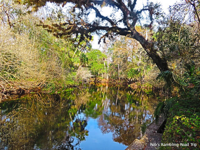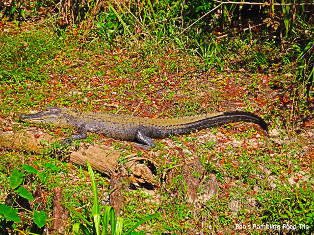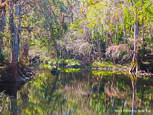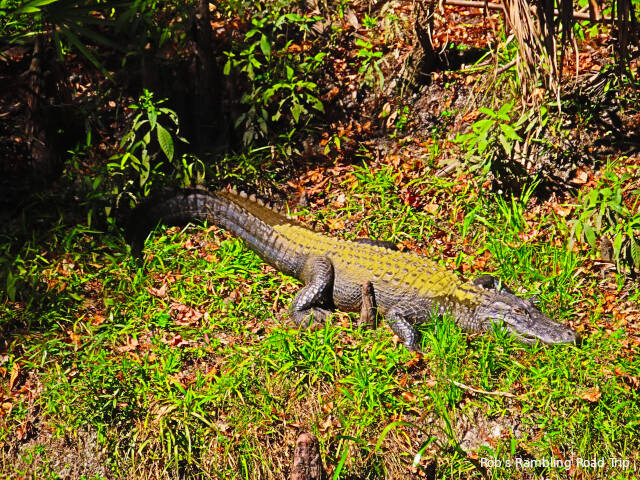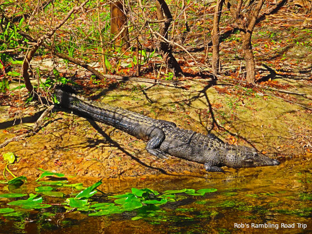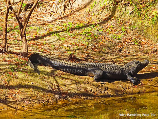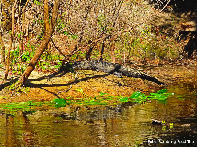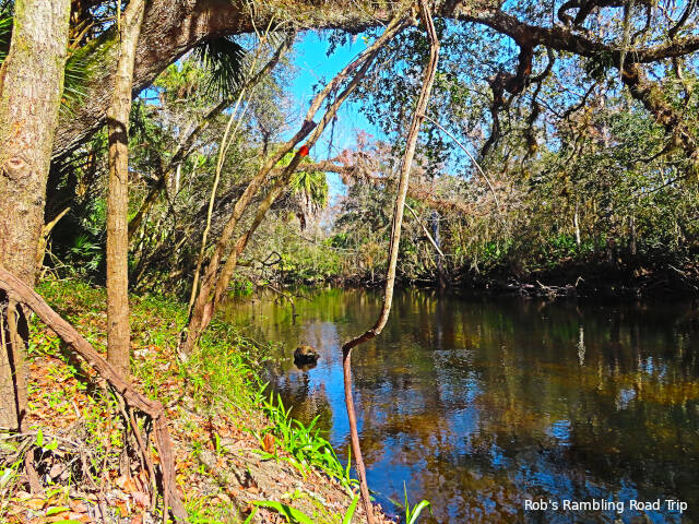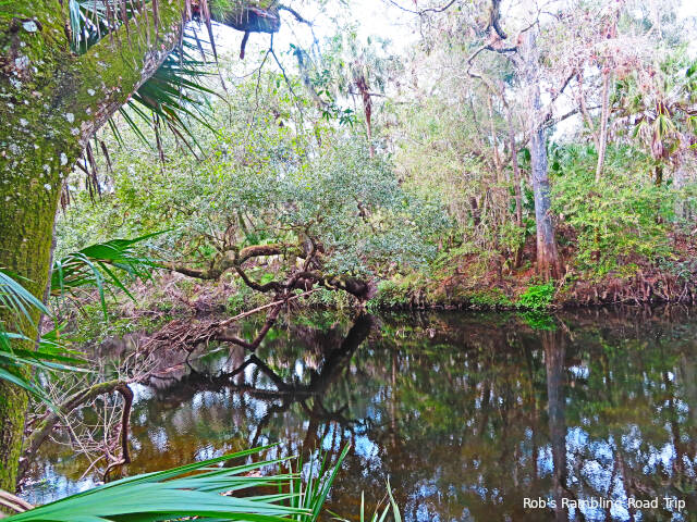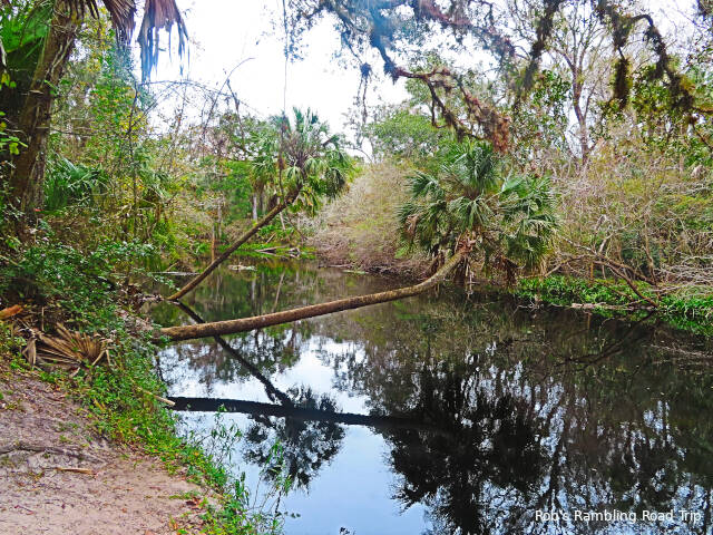 This afternoon I hiked the Seminole trail on the far side of the Hillsborough River from the state park’s campground. It is a 3.2 mile loop trail that follows the river for the first third or so of its length. The trail is labeled “moderate” because it goes up and down a few twenty foot slopes with lots of exposed roots. It really isn’t very difficult. The worst part of the trail is the mud. If the water level was any higher some areas would be impassable. With the current water level the ground in some areas was wet and slippery, but not squishy. The sides of my shoes did not come in contact with the mud.