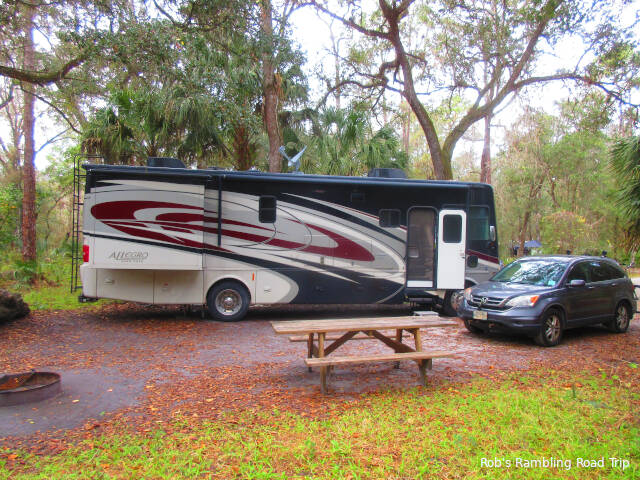 Hooking up to depart Lake Manatee State Park isn’t easy. I have to move the car to the day use area so I have room to hook it up to the motorhome. Then after walking back to my site I can finish getting ready to depart. Before I can drive the motorhome to the car, I have to stop at the dump station to empty my holding tanks. Today it took over half an hour to wait for two vehicles ahead to dump and move on. It was three minutes after the 1PM checkout as I pulled out of the park.
