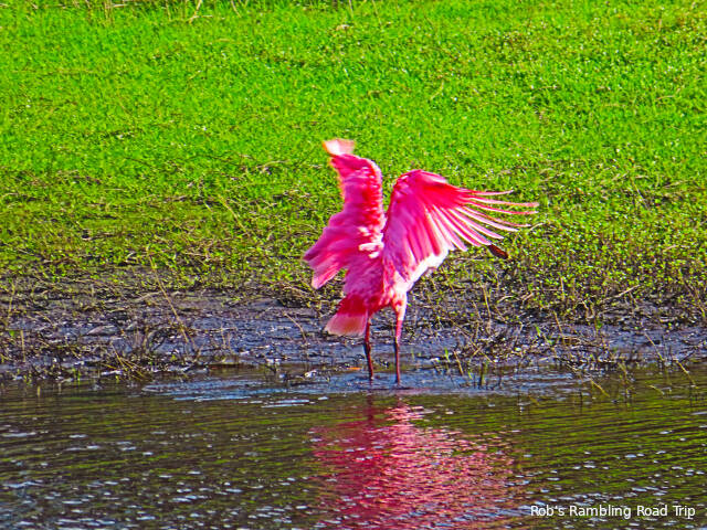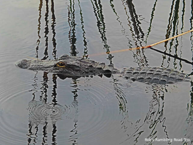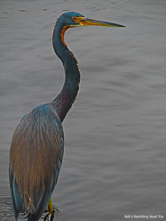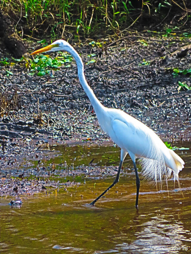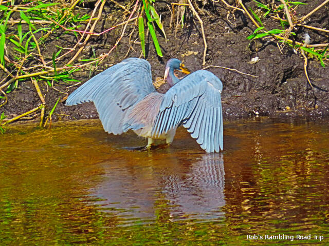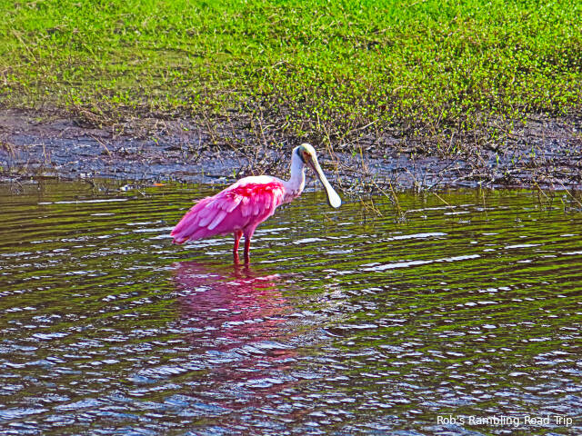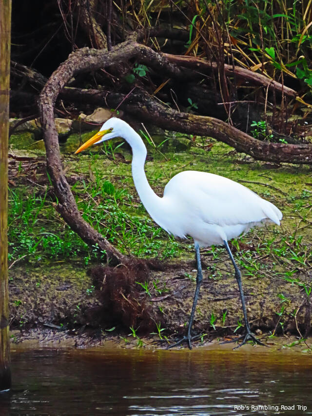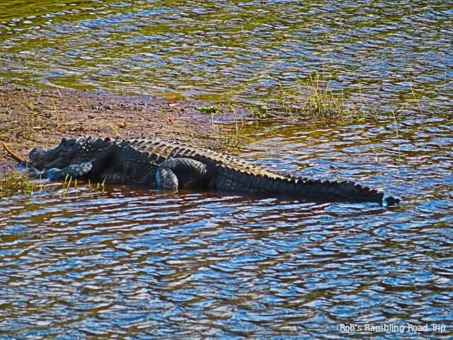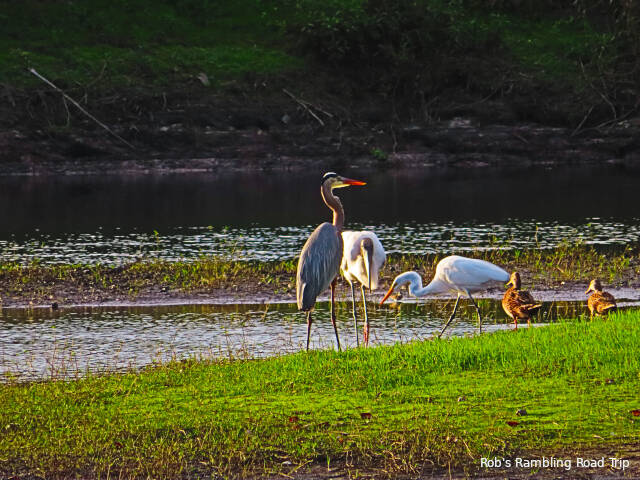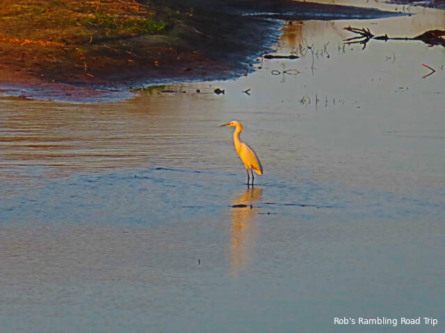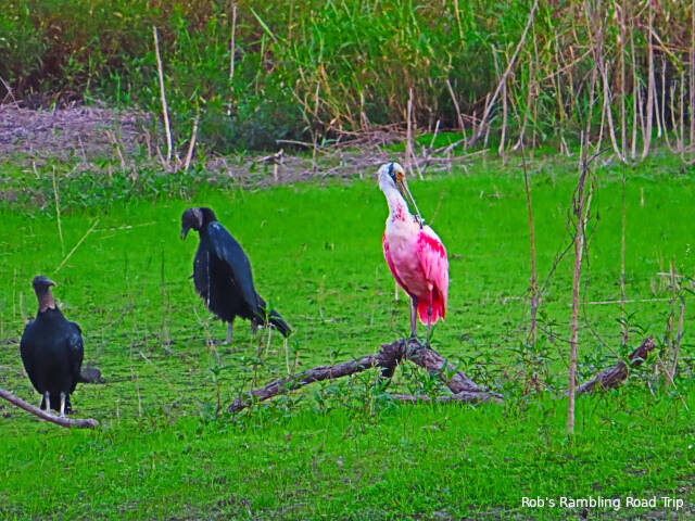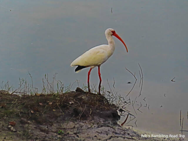 Before and after my repair mission, I searched the State Park for wildlife. The cooler cloudy weather seemed to keep many of the creatures in hiding. Very few gators were on the bank, but a few heads were above the surface of the water. Many of the birds seemed to be hiding out from the wind and chill of the day. I could see many more white, pink and gray specs in the distant trees than I saw out on the river bank. I still managed to take a few pictures of the birds I saw.