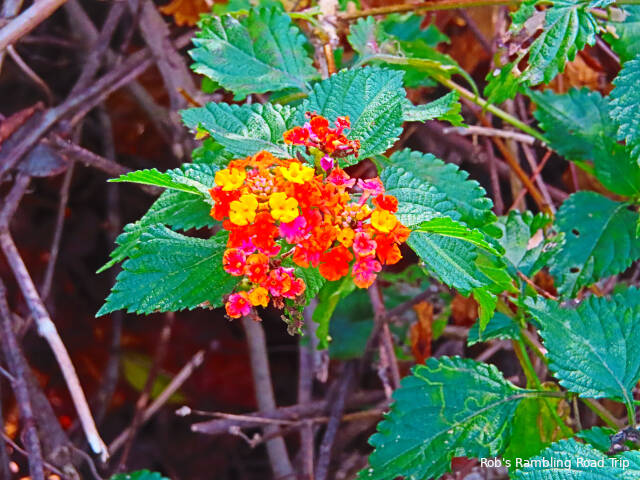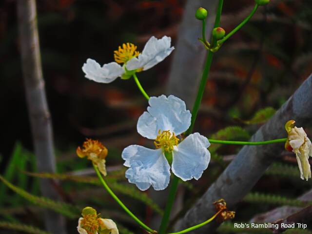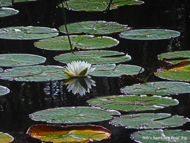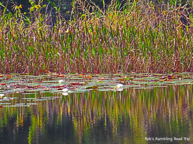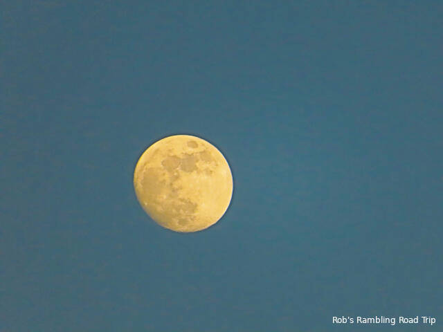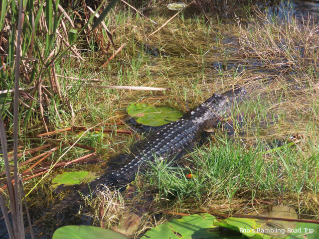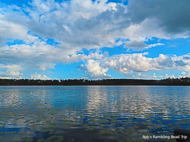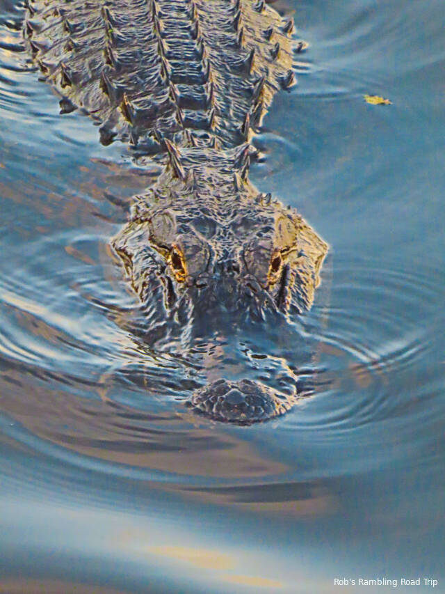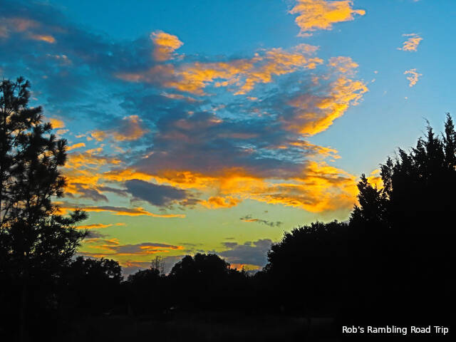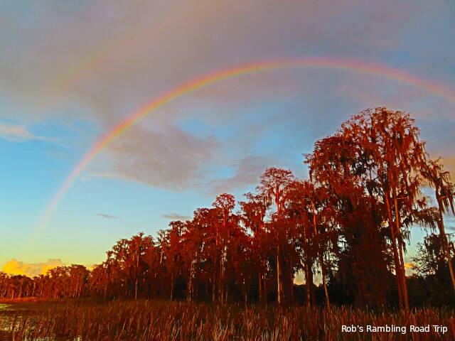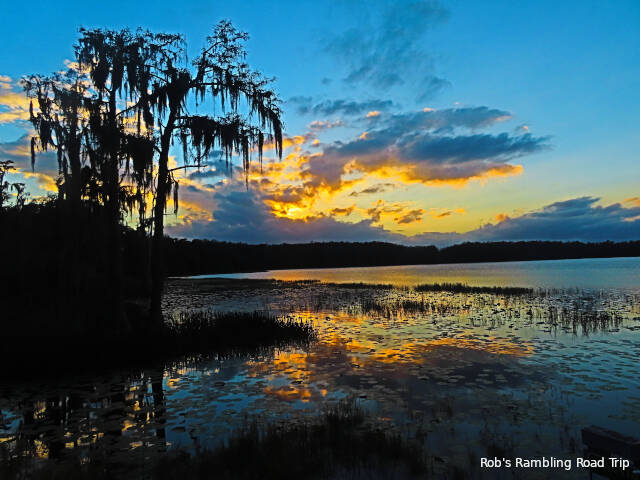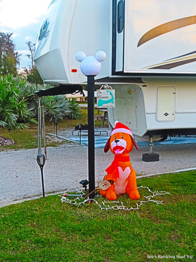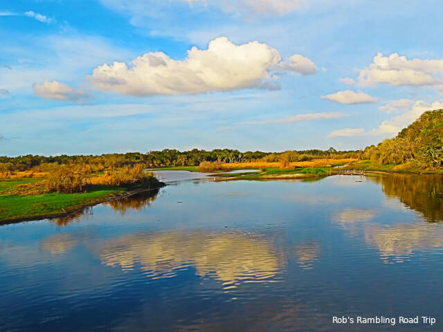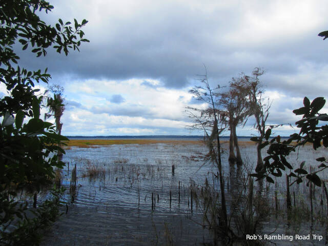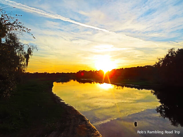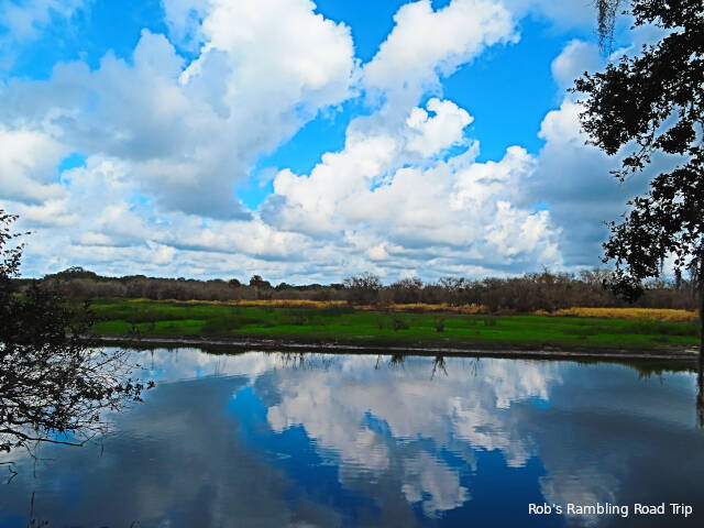 The forecast rain arrived overnight. It didn’t sound particularly heavy on the roof of my RV home, but I slept through most of it. This morning I woke to the sound of heavy rain on the roof. Once I turned on the TV, I found the area was under a tornado watch. Once again, I must have slept through the worst of the storm. It didn’t seem particularly bad. When I ventured out after the storm, I found a moat around my campsite and evidence of many dead palm branches and Spanish moss blown from the trees. The day was mostly cloudy with a high temperature in the low seventies. This evening it is raining again. Tomorrow is forecast to be sunny and Florida cold.
