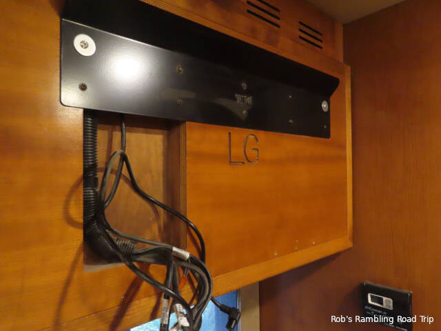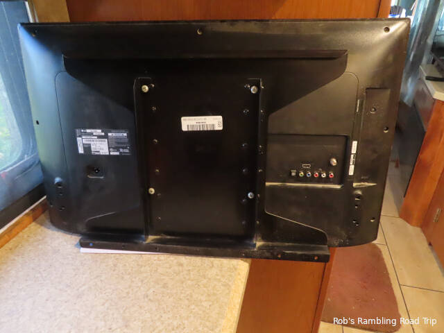 I finally got my new TV permanently mounted in the bedroom. Early this afternoon I went back to Home Depot for the Loctite to keep the bolts from vibrating loose. Once back at my RV home I took the TV down from its temporary mount and installed the mounting bracket with all four bolts using the Loctite thread glue. I used several garden hose washers as spacers to align the mount along the irregular shape of the plastic back to the TV. After all of the connections to the antenna, Satellite receiver and DVD were made, I tested the TV one last time. With everything tested I put the final six screws in to lock the bottom of the mounting bracket to the cabinet door behind the TV. It should be fine in the earthquakes of travel on bumpy roads.