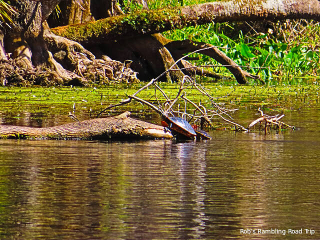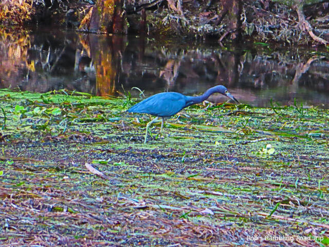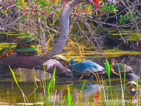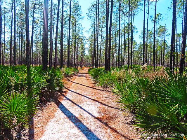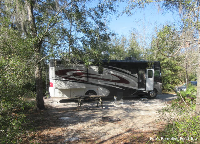 I was back on the unmarked trails behind my campsite today. The main trails seem to form a figure eight or two squarish circles stacked on top of each other. There are also several spur trails off to the west that go to the river. The spur trails are not easy to walk. The ground along those trails is torn up from the foraging of feral hogs. I’ve seen similar disturbed ground on most of my hikes in Florida State Parks. They can be a big problem. The hogs are active at night, so I shouldn’t have any undesired encounters.