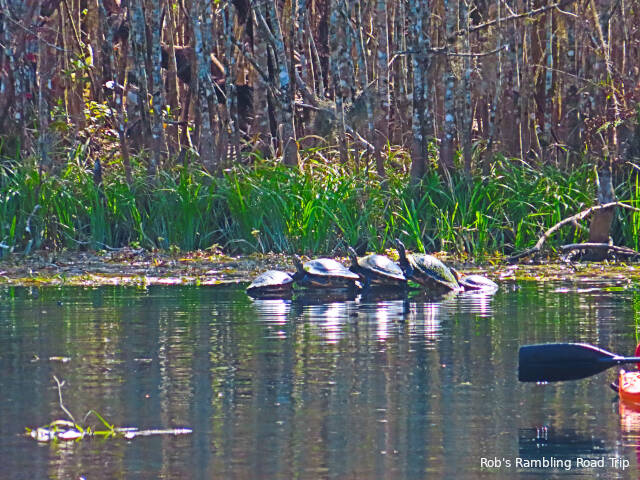 It is hard to believe this is a holiday weekend. The mix of Florida license plates to other states changed a little bit today. There are more Florida tags for the weekend. Most of the weekend arrivals came with two or more kayaks on the roof of the tow vehicles. Along with the kayaks came some pretty interesting contraptions to transport the boats to the river. Today I say one made with bicycle wheels that carried two stacked kayaks. They towed the kayak trailer contraption behind a bicycle.
