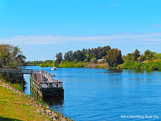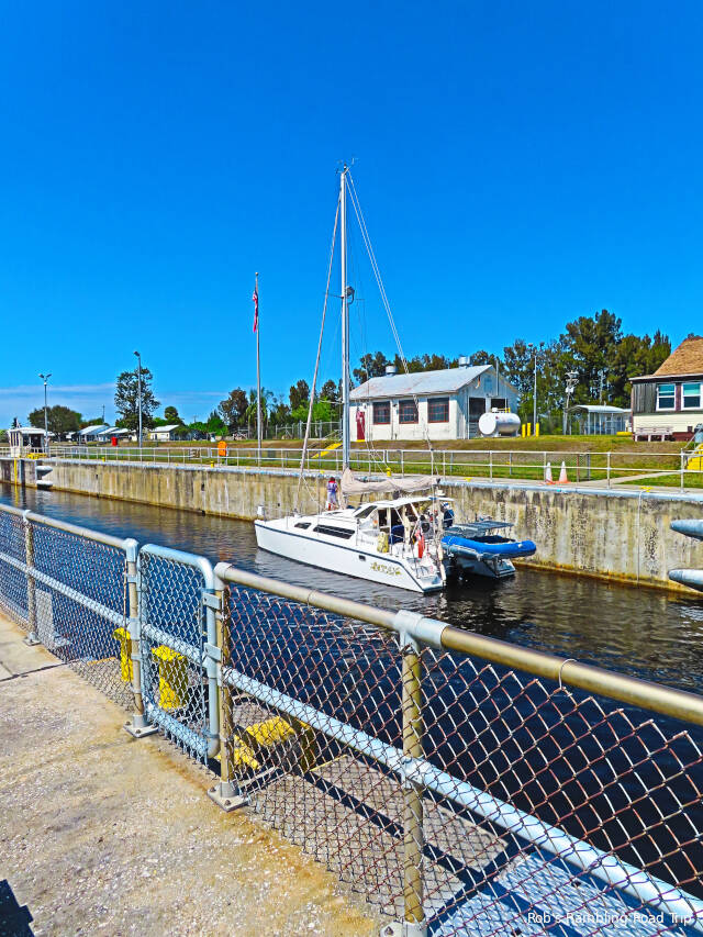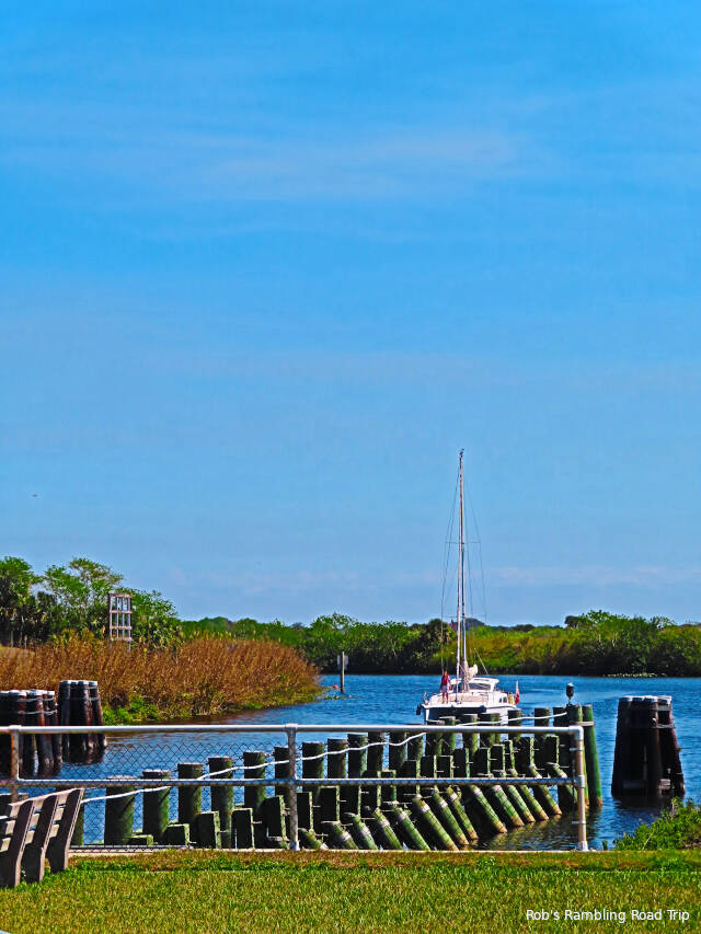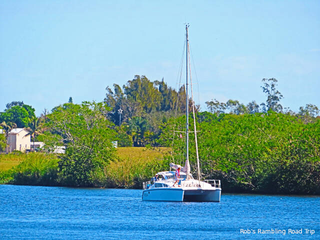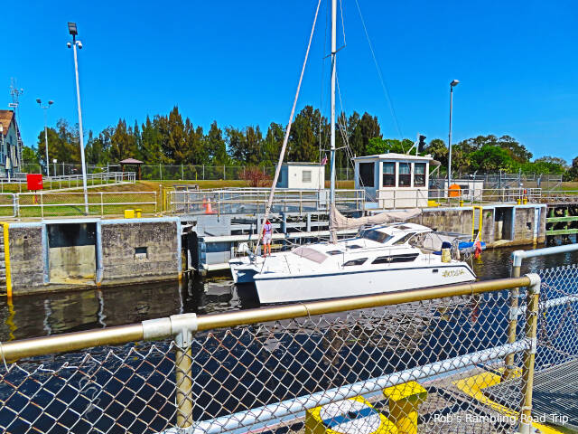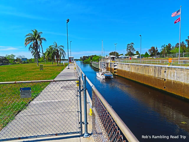 Today I made it a point to watch for boats passing through the lock. Shortly before noon I spotted a catamaran coming down river toward the lock. I walked across the dam to the observation area on the side of the lock to follow it through. The boat turned out to be out of Bermuda. The couple on board must be spending the winter in Florida. It was the only boat I saw lock through during the day.