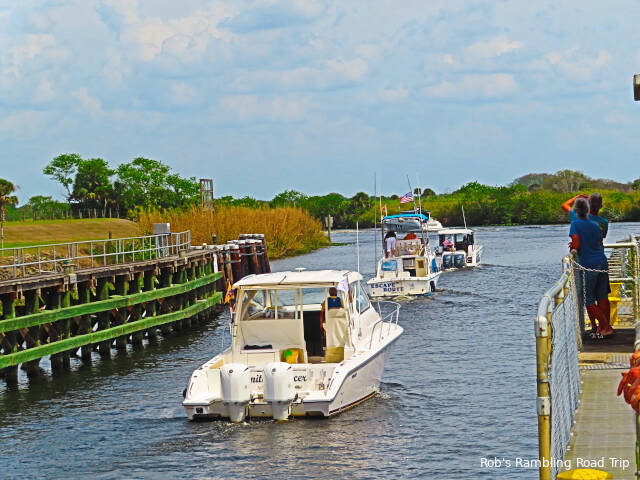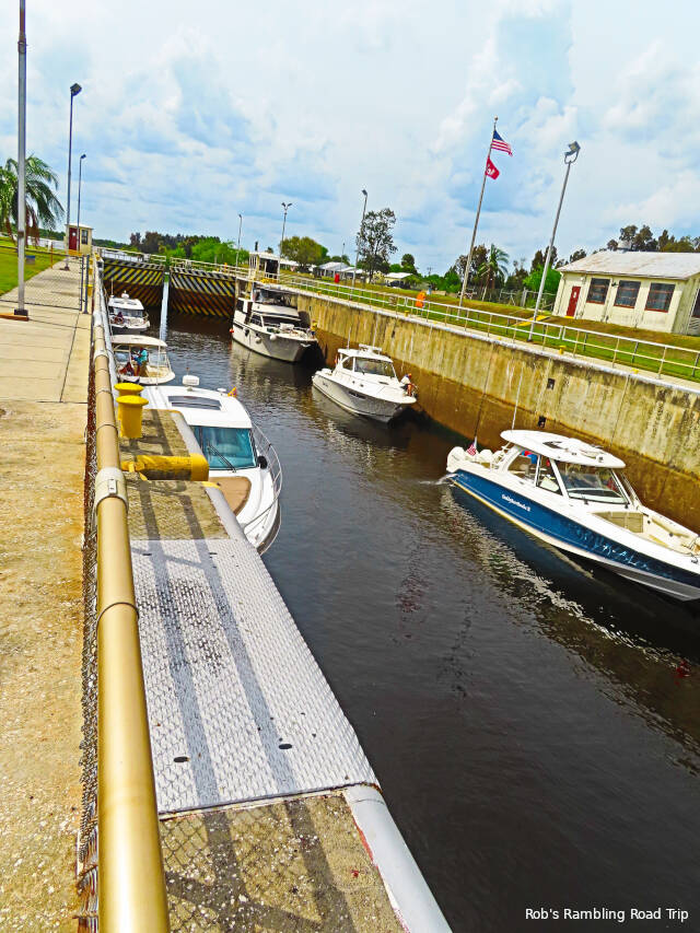 The Ortona Lock was very busy today. I watched about five lock openings most with multiple boats in the lock. Ten boats from a Naples Yacht club passed through going upstream toward Lake Okeechobee for the weekend. The group was divided into two separate lock rises. Six boats seems to be the limit for this lock. I also watched one boat from Canada with a language issue understanding directions. The lock master wanted them on the opposite side of the lock than they were setup to use. The hand signals were wild.