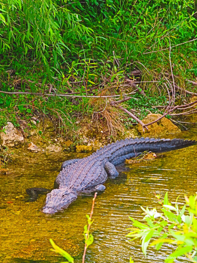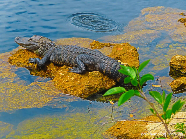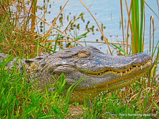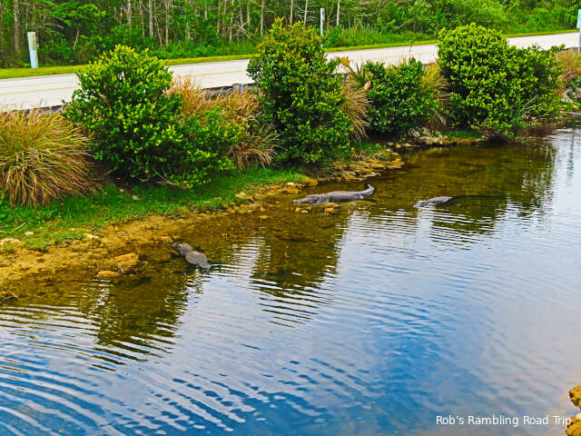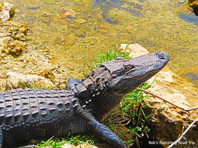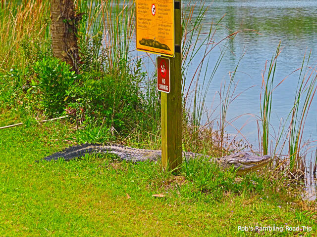 Walking the campground loop around the pond this morning I had my first visit on this stay with the resident alligator. Just to be sure the tourists knew what he was, he was camped out under the alligator warning sign. This is a fairly big gator that I think has lived in this pond for several years. People are repeatedly warned not to walk their dogs close to the pond.