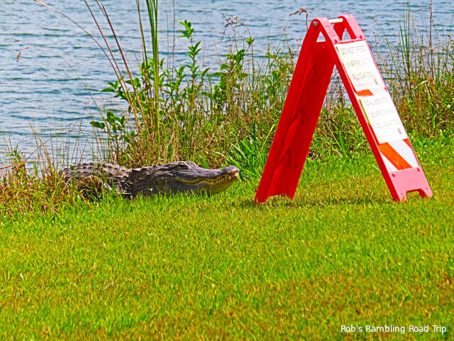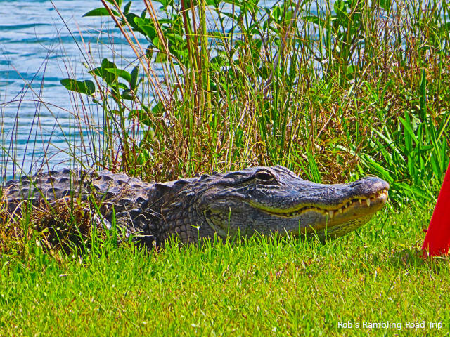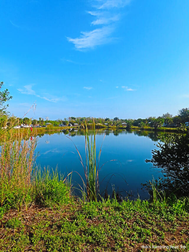 The extent of my exercise for the day was several loops around the campground pond. It was an interesting exercise to see where the alligator was hiding out each time I ventured out. I now suspect there are two gators in the pond. I haven’t seen them both on the same loop, but one looks smaller than the other. The other thing that I find odd is the absence of other wildlife. There are no water birds or turtles present along the edge of the pond.