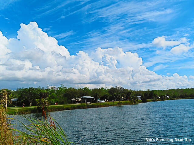 The rain got in the way of my activities today. I was getting ready to get in the car to head for one of the trail heads west on the Tamiami trail, when the sky opened with another tropical deluge. While I waited it out I prepared some lunch and had an early meal. The rain let up and I started to prepare to depart again, but mother nature had other ideas. The second wave of rain arrived. Between the two downpours the road in front of my RV and the grass across the road were flooded under a couple inches of water. It was late in the day for exploring by the time the sun returned.