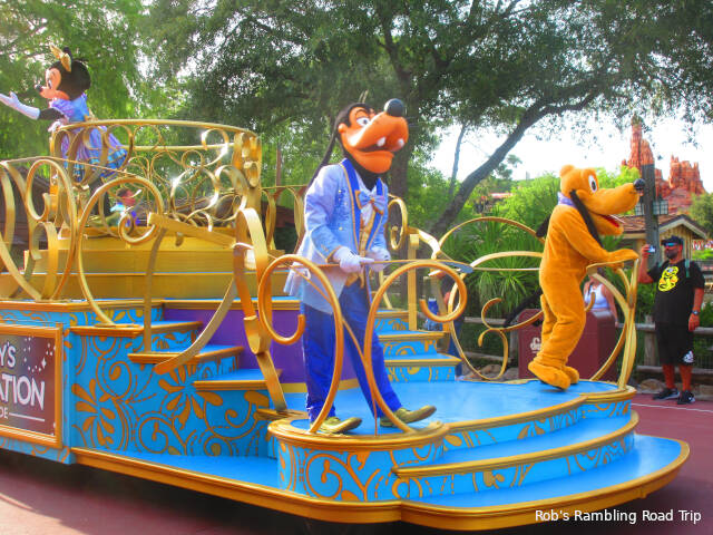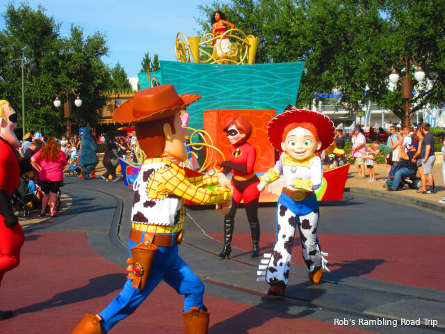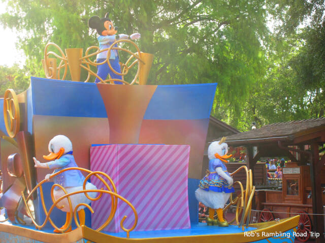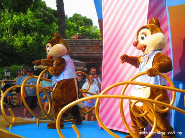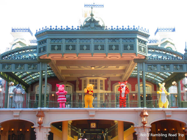 My goal for the evening was to ride some of the attractions I hadn’t been on this spring and watch the evening fireworks show. I achieved that goal and saw a lot of characters too. Two different Cavalcades of characters passed my route of wander through the park and Winnie the Poo and his friends were up on the Main Street USA Train Station.