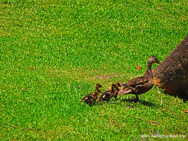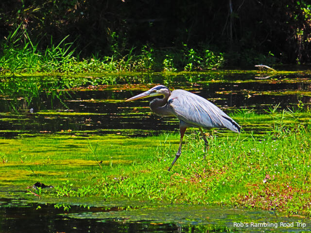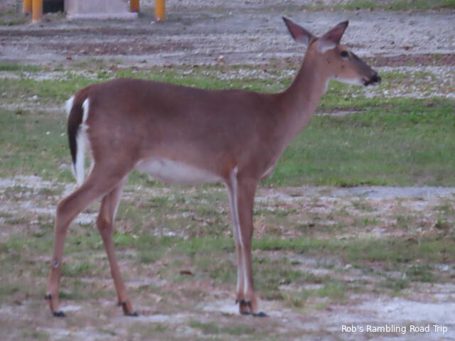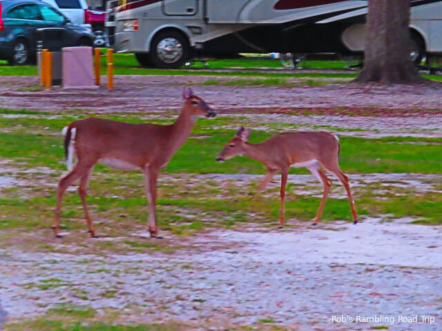 The campground emptied out of the weekenders today. Most were gone by the 11am checkout time, but some paid for the extra day and stayed until the late afternoon. As the people departed the animal residents started to come out of hiding. This noon a Great Blue Heron was wandering around the retention pond looking for food. Later in the afternoon I spotted the most recent duck family wandering across the grass toward the water. This evening three deer decided to wander through the campground. They were very used to the people. The deer wandered into campsites with people sitting at tables and allowed me to get within twenty feet with my camera. Most of the area on three sides of this resort are heavily developed. I’m not sure where the deer actually live.