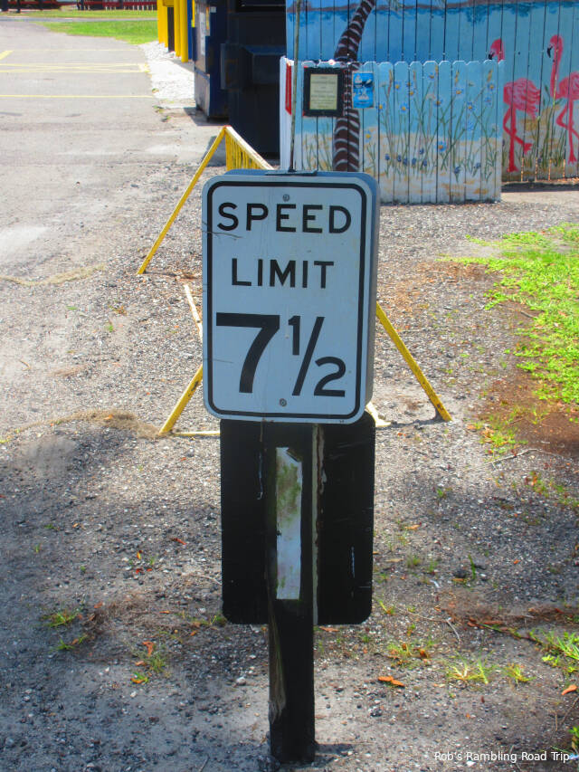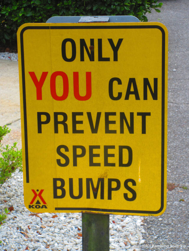 This afternoon while walking in the campground I was almost run over by a fast moving golf cart. Fast moving traffic has always been a problem in campgrounds and the recent popularity of golf carts has only added to the problem. This park has signs indicating a speed limit of 7.5mph and other signs reminding everyone to slow down. One sign in particular says “Only You Can Prevent Speed Bumps.”