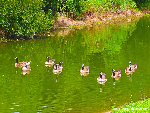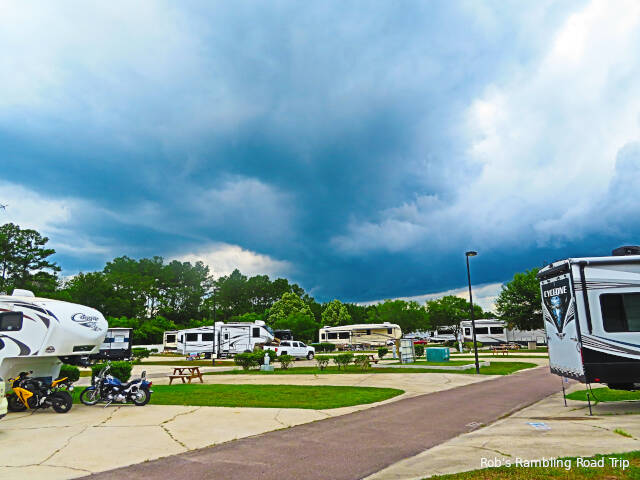 I only got one walk around the RV park in today. The arrival of rain cut my second attempt short. A few people have arrived for the weekend and a few of the long term residents have departed for the weekend. It is still odd to see a site with a car and all of the outside furniture but no RV. This afternoon my cross street neighbors created that condition when they pulled their trailer out for the weekend. There doesn’t seem to be anything holiday specific scheduled at the RV resort this weekend.