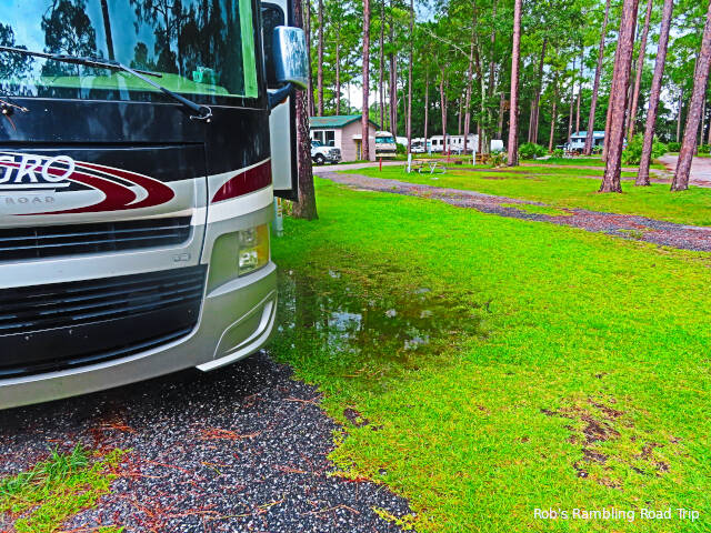 The problem with short travel days is the need to kill time so I don’t arrive before my new site is ready. Today was one of those days. I sat in my RV home in the Georgia Welcome center parking lot for close to two hours. My destination was in sight on the other side of the Interstate. Shortly after 1PM I drove to the Jacksonville North/St. Marys KOA and got checked in. One of the advantages of this location is the tall pines that provide some shade. That is very different from my last five weeks fully exposed to the heat of the sun.