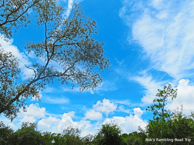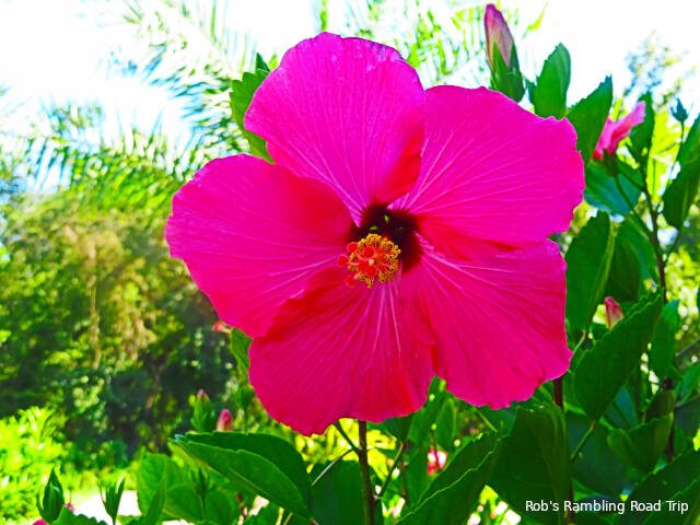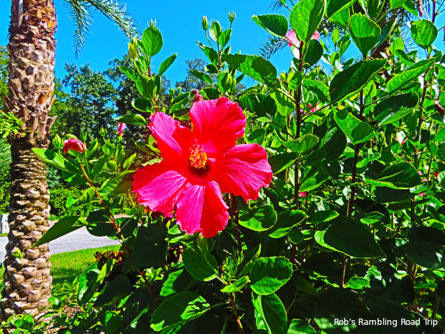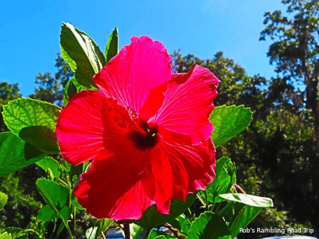 The beautiful Hibiscus bushes around the campground continue to bloom. Most of the blossoms seem to be a shade of red. They take on different tints as they age, get subject to the sun or get rained on. The park doesn’t seem to have planted any white, yellow or variegated varieties of the plant. Either way, they are very impressive flowers and good candidates for photos.