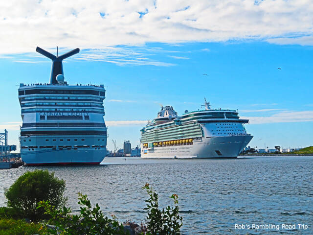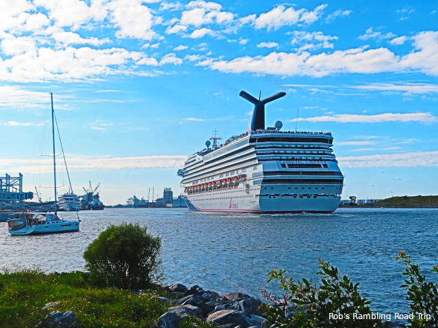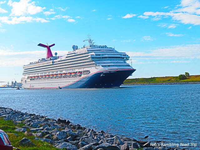 Today things didn’t go according to plan. The first ship scheduled to depart at 3:30PM was the Carnival Liberty. It was docked at terminal 3 near the campground and the closest terminal to the ocean. I think the idea is to get it out of the way to provide more room for ships and small craft to maneuver. Today there was some form of medical emergency on the dock when the ship was scheduled to depart. The rescue squad and an ambulance had to attend to someone. I think it was probably a dock worker, since all of the gangways to the ship were retracted. The ship’s departure was delayed close to an hour.