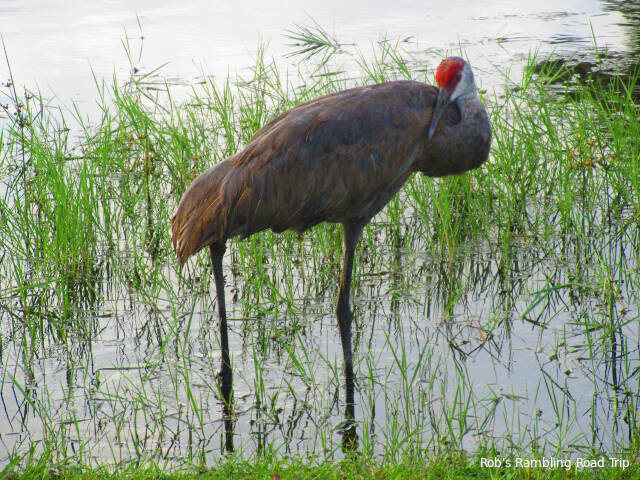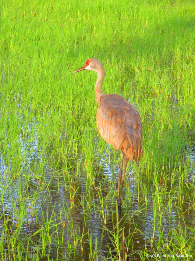 Chores around my RV home took up most of my time today. In between the various tasks I took a couple of walks around the RV resort. The local birds were all hiding in the shade on my mid day walk. On my second walk the ducks and one of the sandhill cranes were out their evening foraging. I even saw the crane with its wings spread. They are a big bird species.
