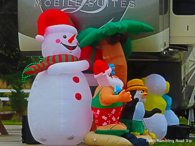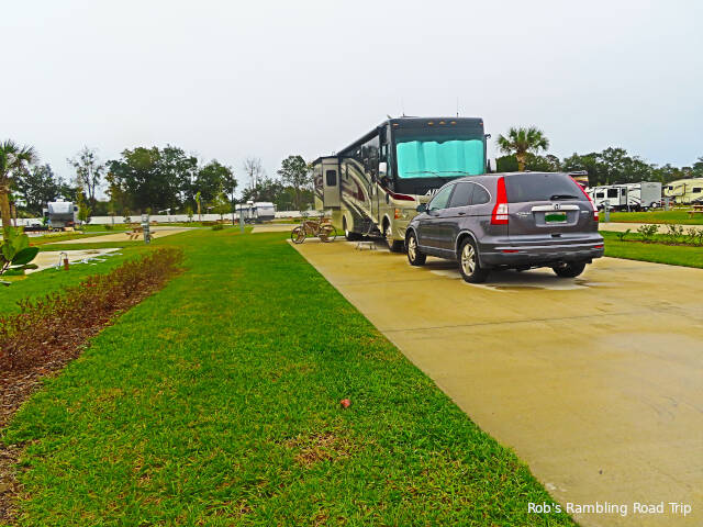 Just before it got dark this evening, I took my daily walk around the RV resort. I was prepared to cut it short if the rain returned, but I got in one good loop. Once again I think there was a net gain in occupancy. Several RVs departed today, but I believe more arrived. I have neighbor on my other side now. There are eight rigs in a row without an empty space tonight.