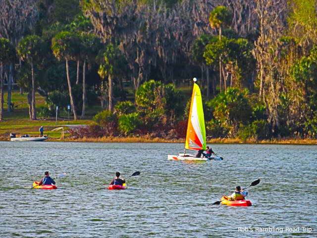 On my late afternoon walk there were a few brave soles out on the lake. Across the lake is a University of Florida recreation area. Students can checkout kayaks, sailboats and other recreation equipment. This afternoon there was a couple of people in a sailboat that really got moving in the strong wind. There were also a group of three kayaks on the lake with the sailboat. I think they could have picked a better weather day for their fun.