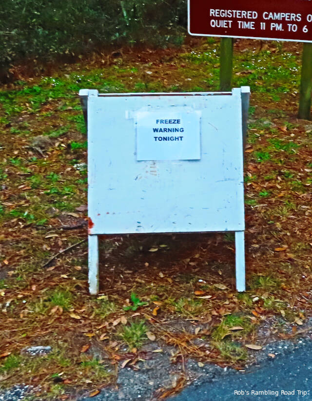 Since it is a weekend, the park including the tent camping area is full. Since it is necessary to reserve sites well in advance, I’m sure none of the tent campers expected to have such a cold night to deal with. When I walked by the area just before dark most of the sites had big fires going in their fire pits. It isn’t bad when you are bundled up for the cold, but do they have warm sleeping bags? I sure hope so.