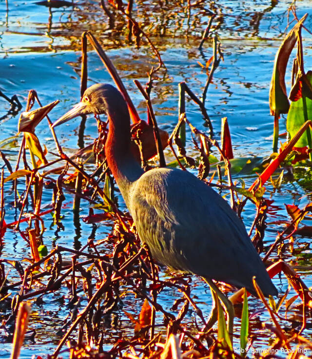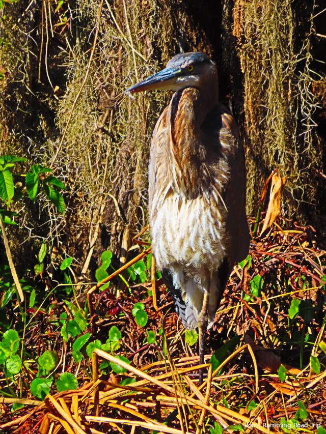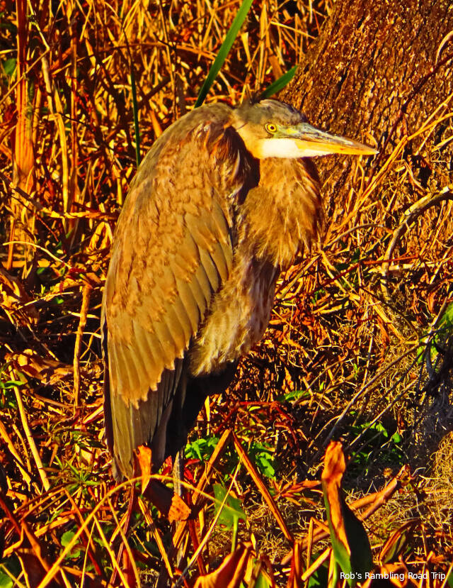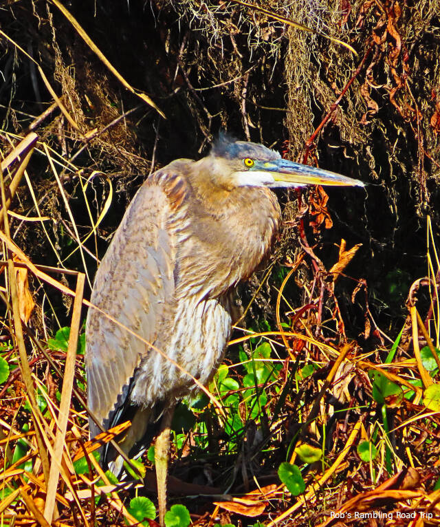 Outside activity today was very similar to Friday. While you were back in the woods sheltered from the wind it was possible to stay comfortable. Out in the open, particularly along the lake shore, it could be very chilly in the wind. Along the shore of the lake there was a Great Blue Heron that demonstrated the weather perfectly. It was scrunched up in a little ball standing in an area protected from the wind in the bright sun. I walked by the area several times today and the bird only moved about six feet. It just looked cold and never seemed to extend its neck to look around. At least it was photogenic. I’ve included several pictures in this blog post.