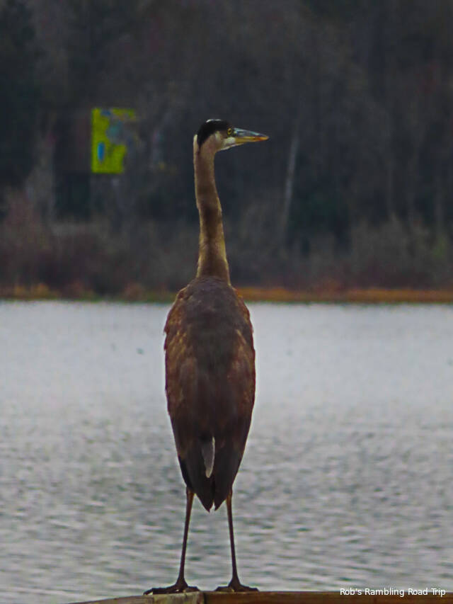 During a brief break in the rain, I got in my one and only walk of the day. The campground was mostly full, but the day use area was empty. On the fishing pier a solitary Great Blue Heron was watching the world go by. It didn’t seem very interested in me as I stood about forty feet away taking pictures. I might have continued taking pictures, but the break in the rain came to an end. I made my way back to my RV home during one of the moderate showers. The trees protected me from getting drenched on the half mile trek.