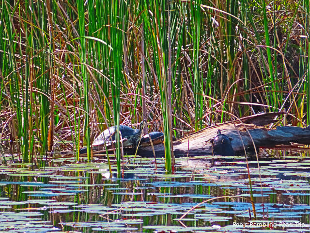 The sun brought the turtles out to warm up on the dead longs along the lake shore. In past visits I’ve seen an alligator on some of the logs, but today it wasn’t around. I’ll keep watching for the alligator during my stay here.